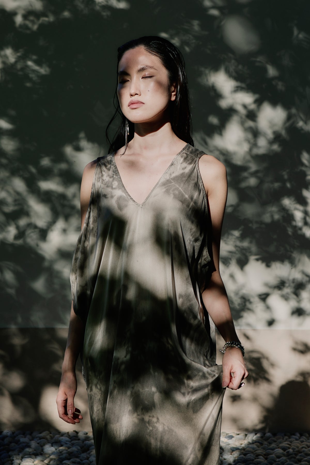 Inspired by our Washed Silk Kaftan in Kundalini White, the Hand-dyed Kaftan in Taupe Blossoms is a testament to effortless elegance and artisanal craftsmanship. Made from 100% luxurious silk, this dress features a fluid silhouette that drapes gracefully, offering both comfort and refinement. The delicate tie-dye pattern - washed in soft grey-brown tones reminiscent of taupe blossoms—is created using natural dye techniques, ensuring that each piece is truly one of a kind. Designed for versatility, it seamlessly transitions from day to evening, embodying a timeless expression of conscious luxury.