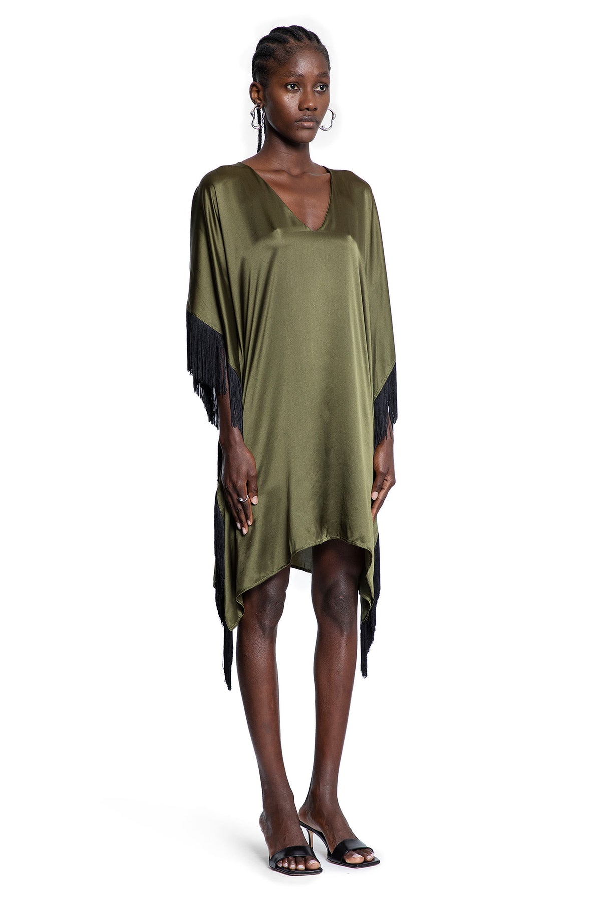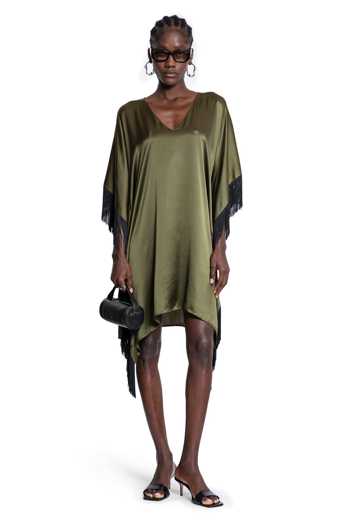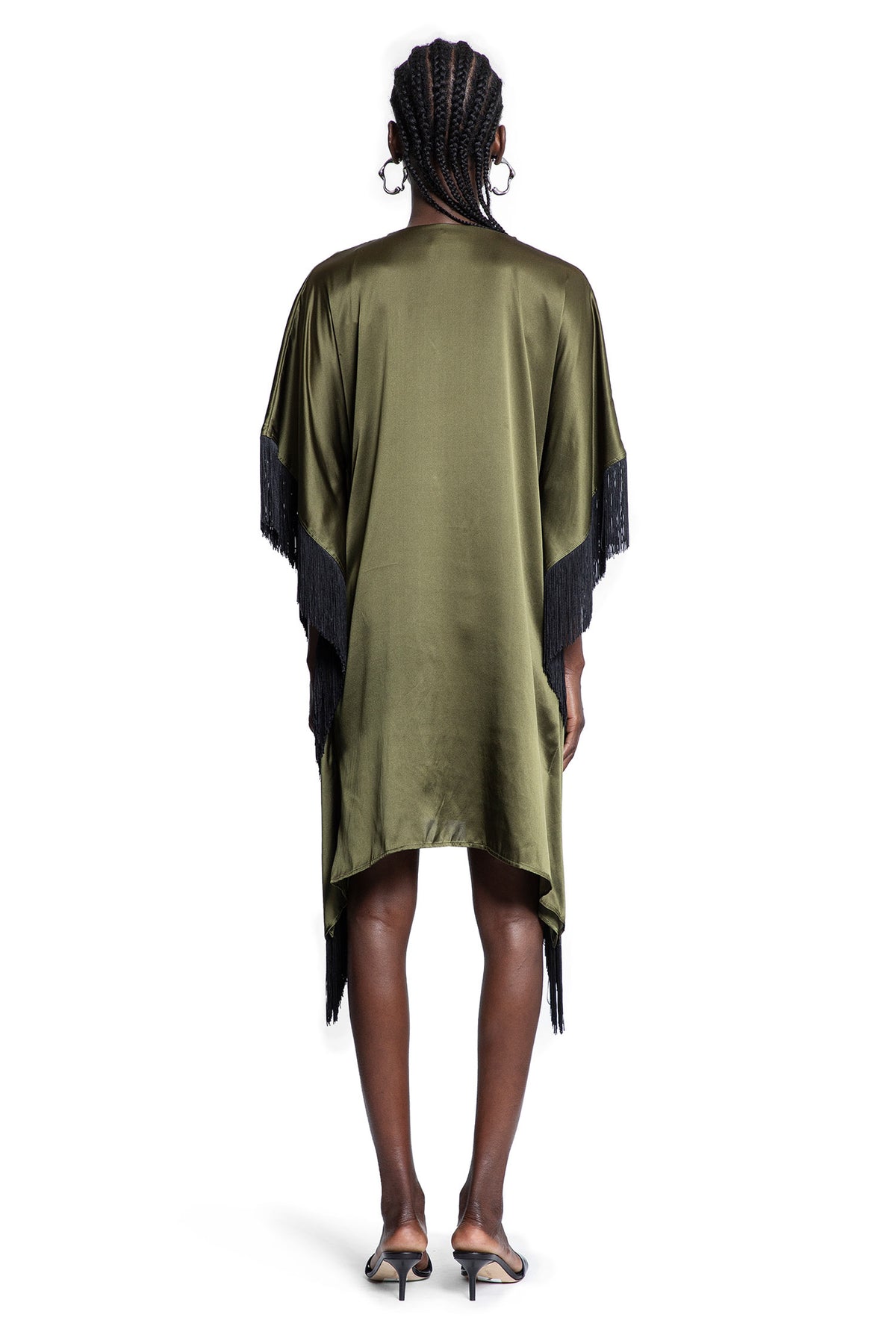 Effortless elegance meets contemporary edge in this olive satin kaftan dress. Crafted from fluid satin that drapes beautifully over the body, the relaxed silhouette features a V-neckline and asymmetrical hem for a flattering finish. Statement black fringe trims cascade from the sleeves, adding movement and a touch of drama to every step. Perfectly styled with minimalist heels and a sleek clutch, this versatile piece transitions seamlessly from resort lounging to evening soirées.