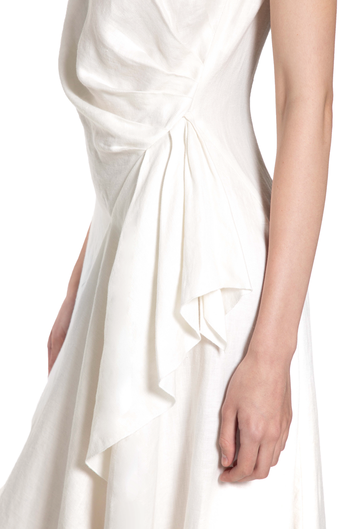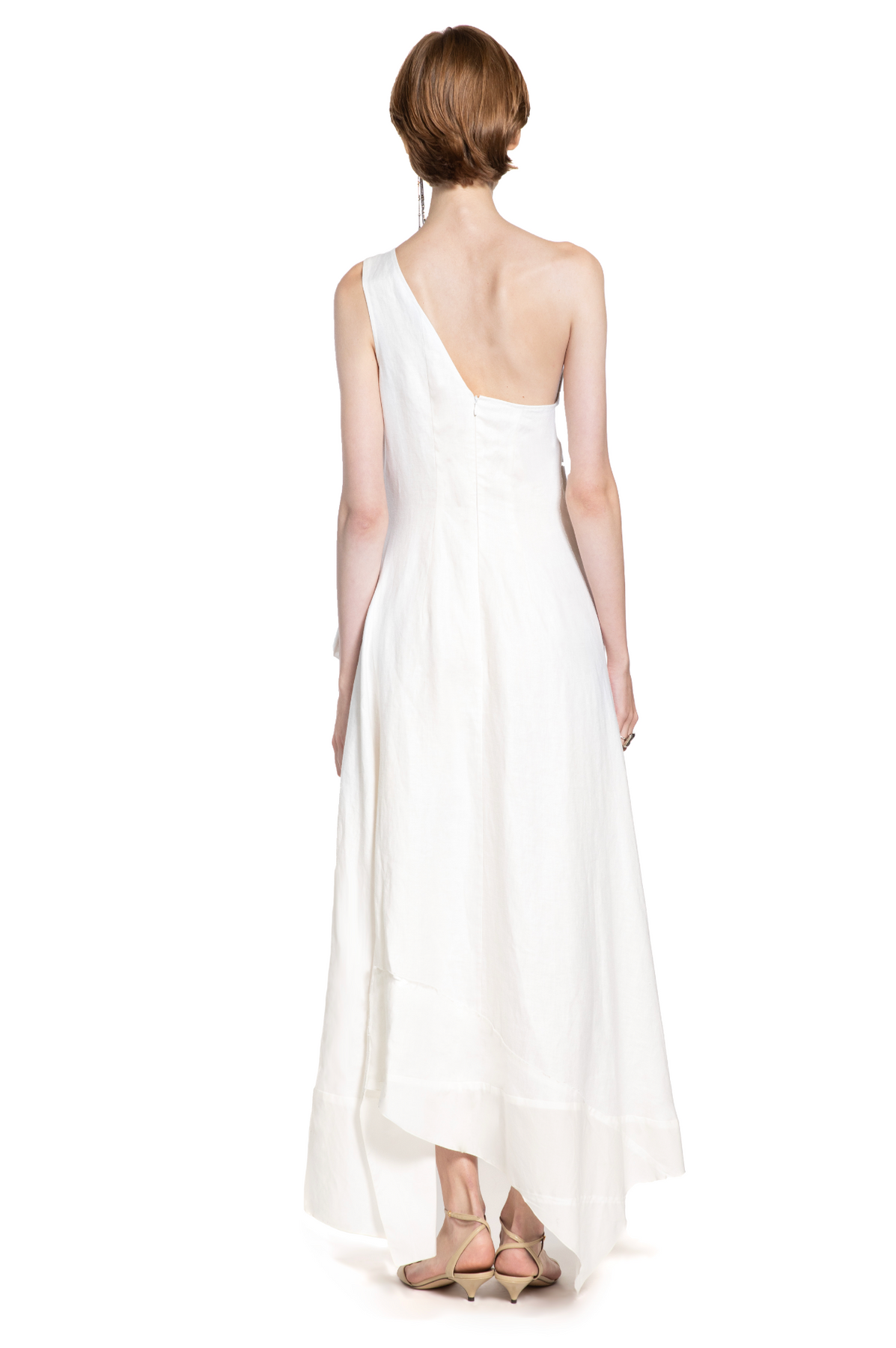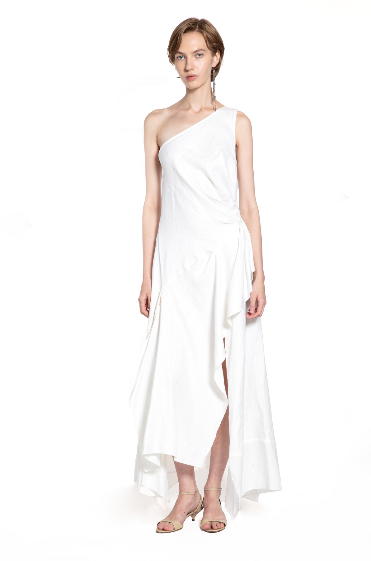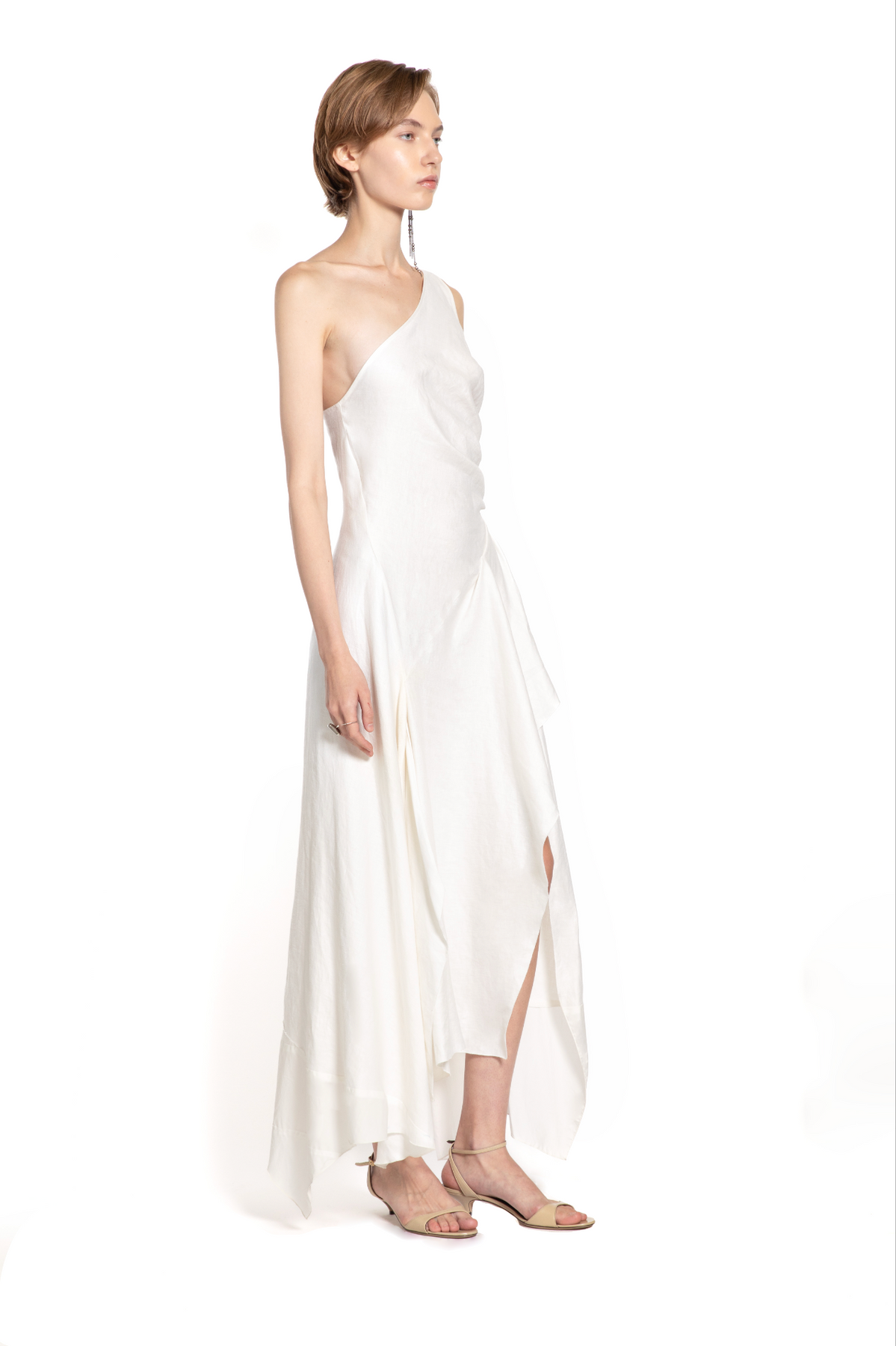 This asymmetric white dress delivers a refined balance of fluidity and structure. Cut on one shoulder for a modern, elevated silhouette, it drapes effortlessly along the body before cascading into a soft, layered hemline that moves with understated drama. The gentle gathering at the side enhances the natural flow of the fabric, creating a sculpted yet relaxed elegance. Perfect for sophisticated daytime affairs, resort settings, or contemporary evening moments, this piece embodies quiet sophistication and timeless minimalism.