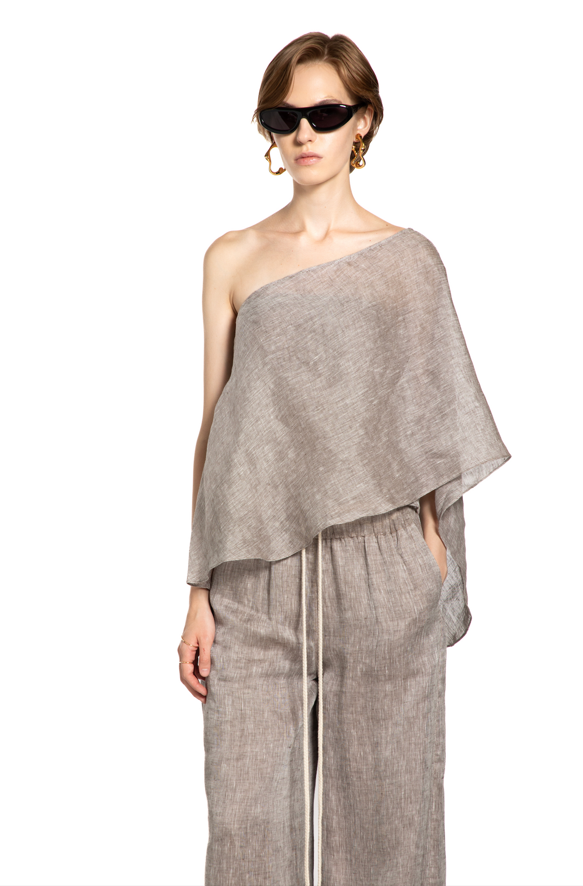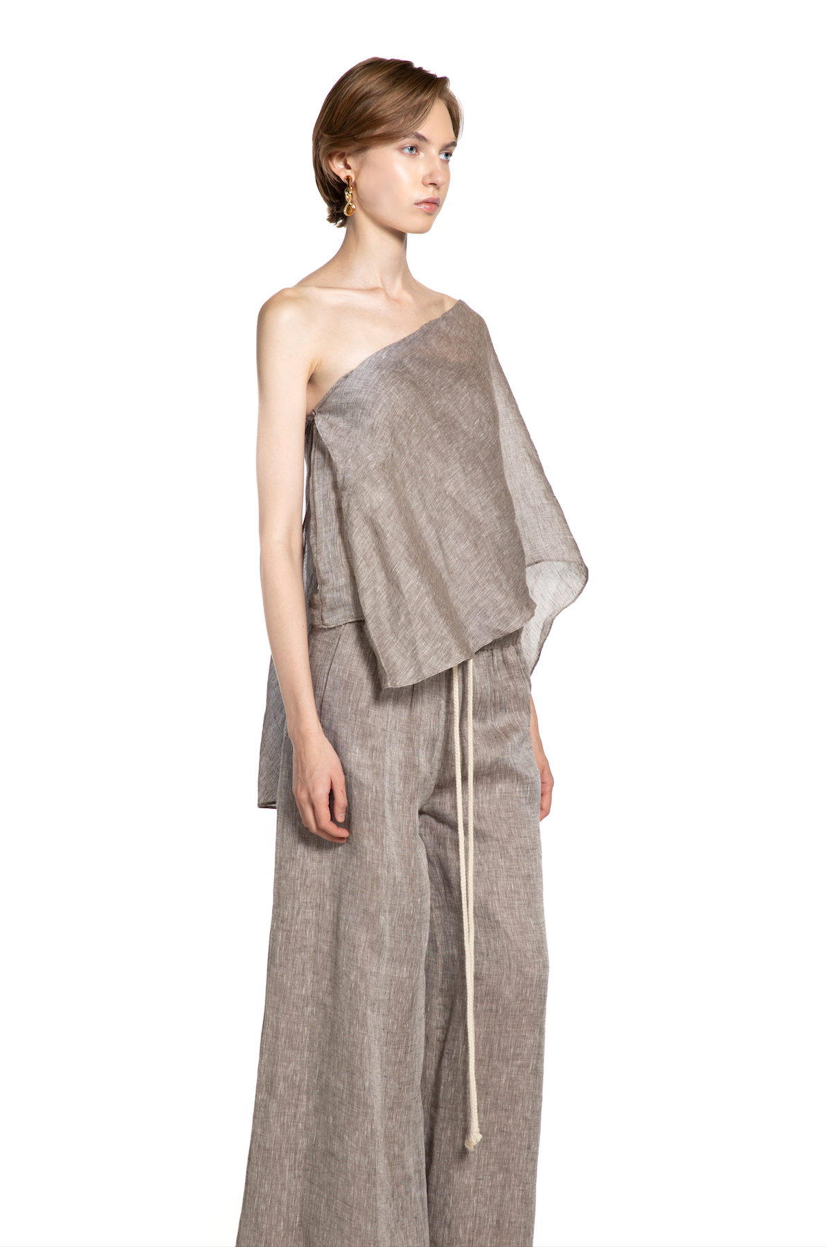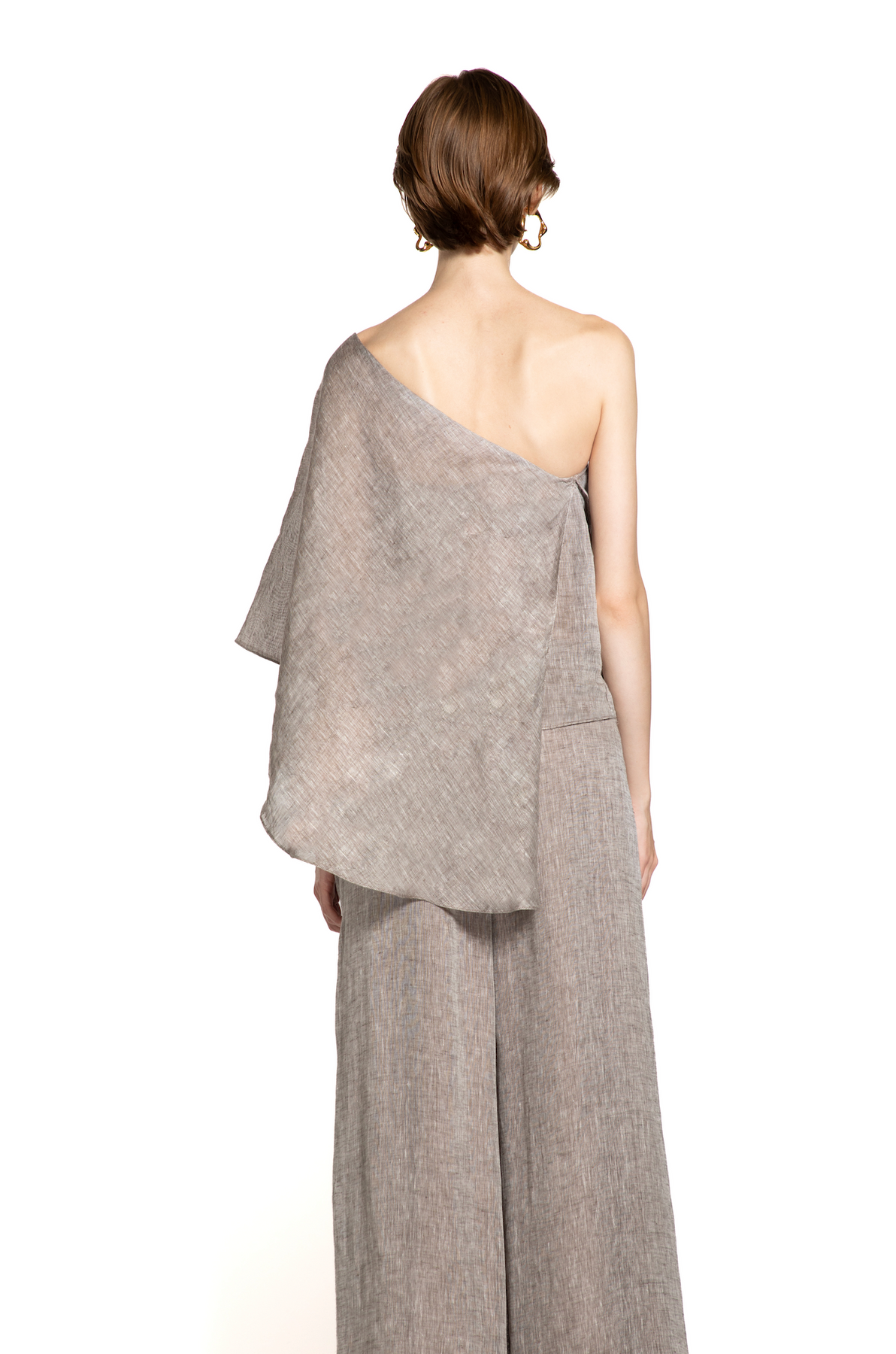 Crafted from lightweight, textured linen, this one-shoulder top channels effortless sophistication with a sculptural edge. The fluid, asymmetric overlay drapes naturally across the body, creating organic movement and a soft, modern silhouette. Designed with breezy and artisanal touch, it brings elevated ease to both resort dressing and city-ready styling.