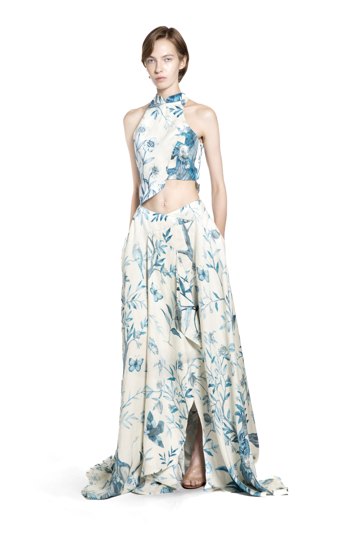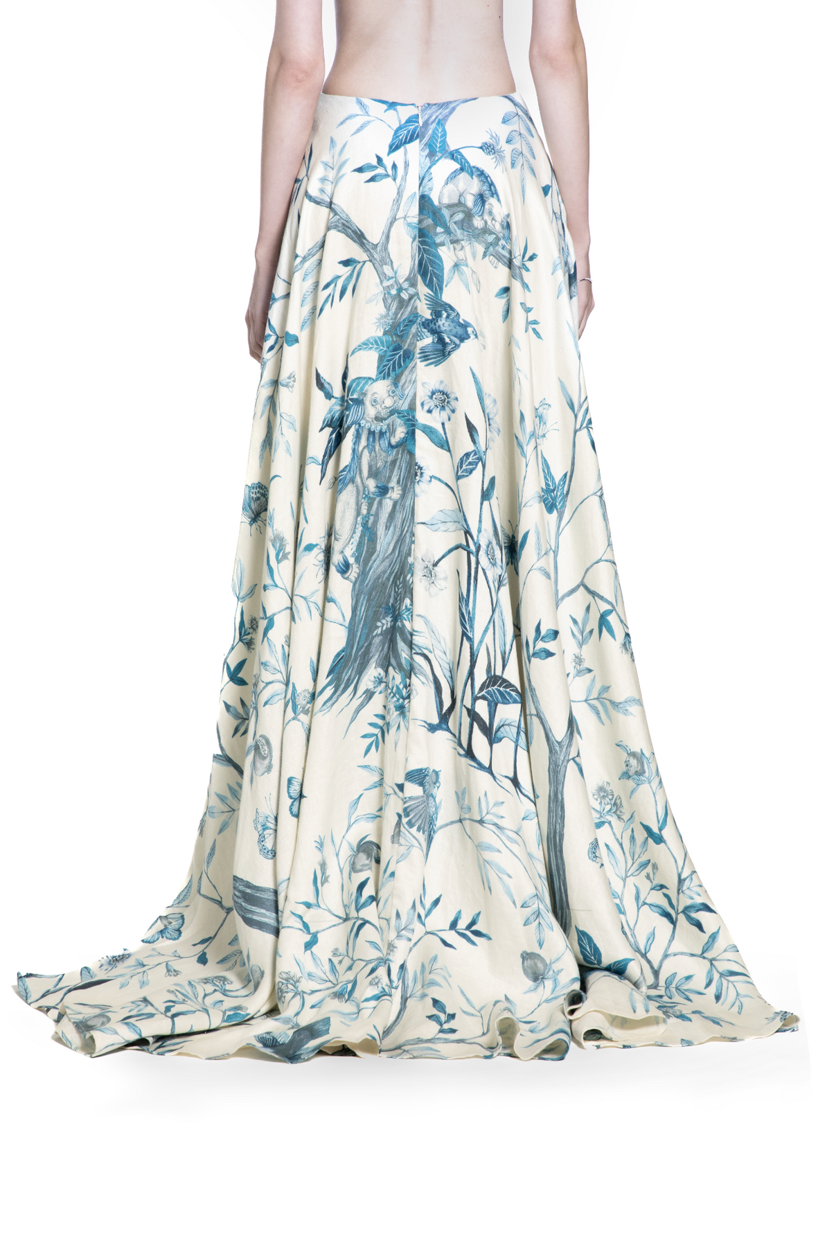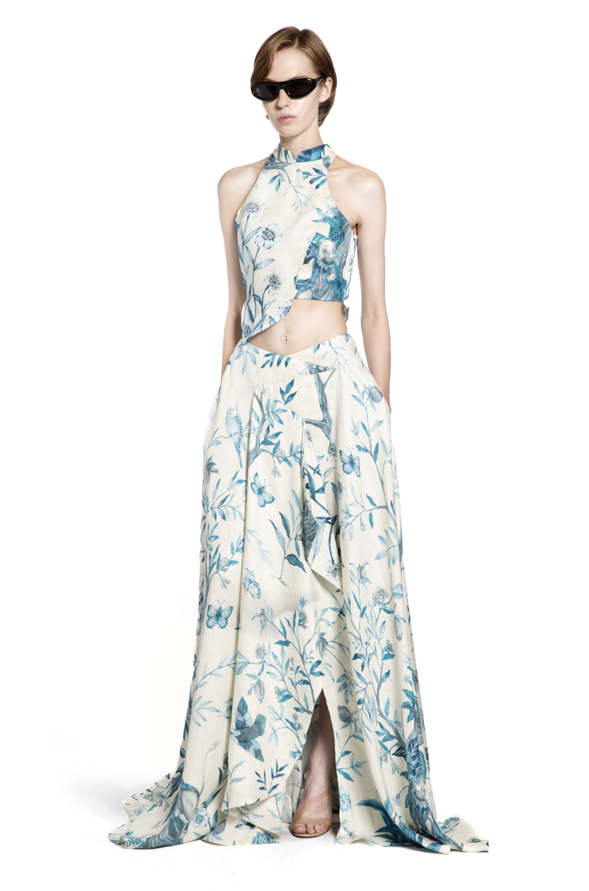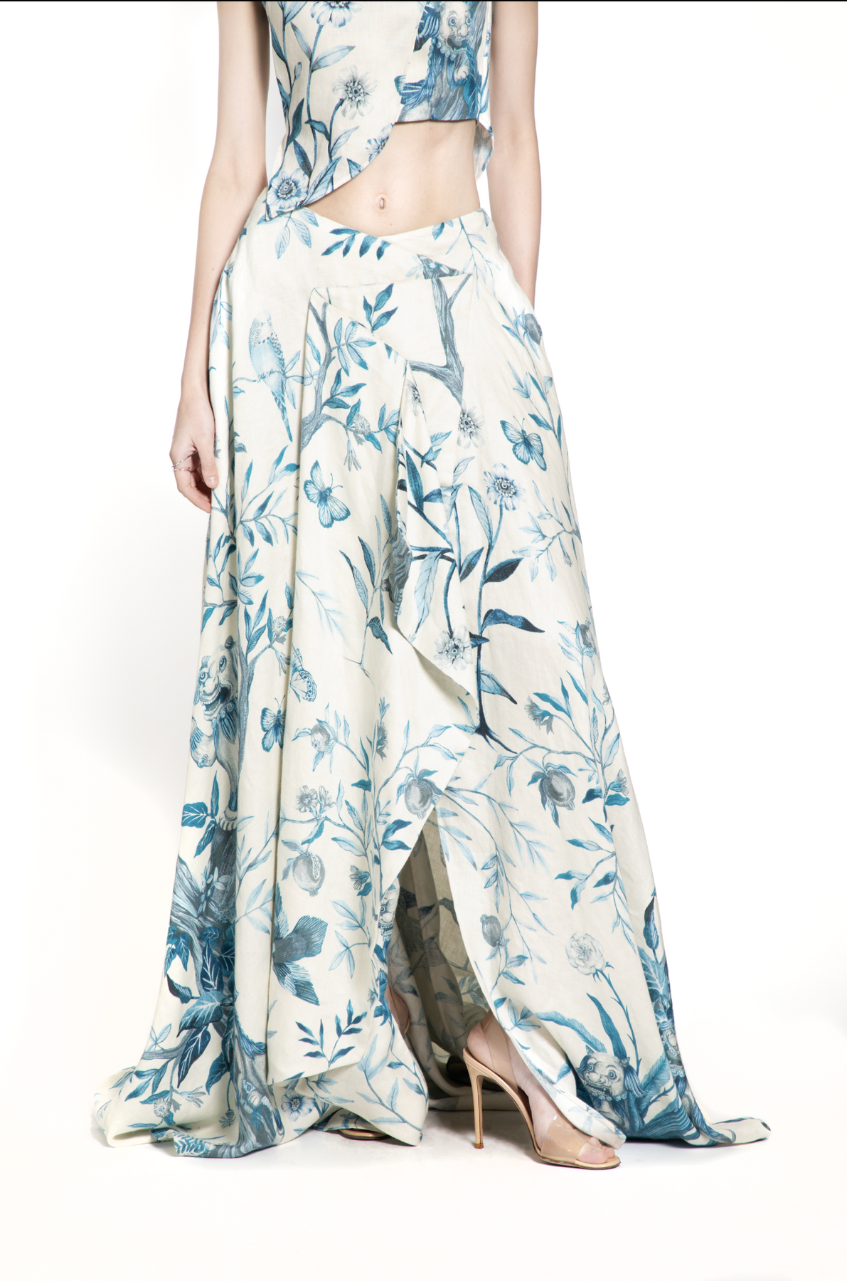 This flowing maxi skirt is crafted from Jim Thompson linen, adorned with a soft-blue botanical print that brings painterly charm to the silhouette. Designed with sweeping volume, the skirt features sculptural pleats and layered paneling that create movement with every step. The high-rise fit flatters the waist, while the fluid hemline adds a sense of effortless elegance. Lightweight and graceful, it’s a standout piece perfect for resort getaways, seaside dinners, or refined daytime dressing—especially when paired with the matching top.