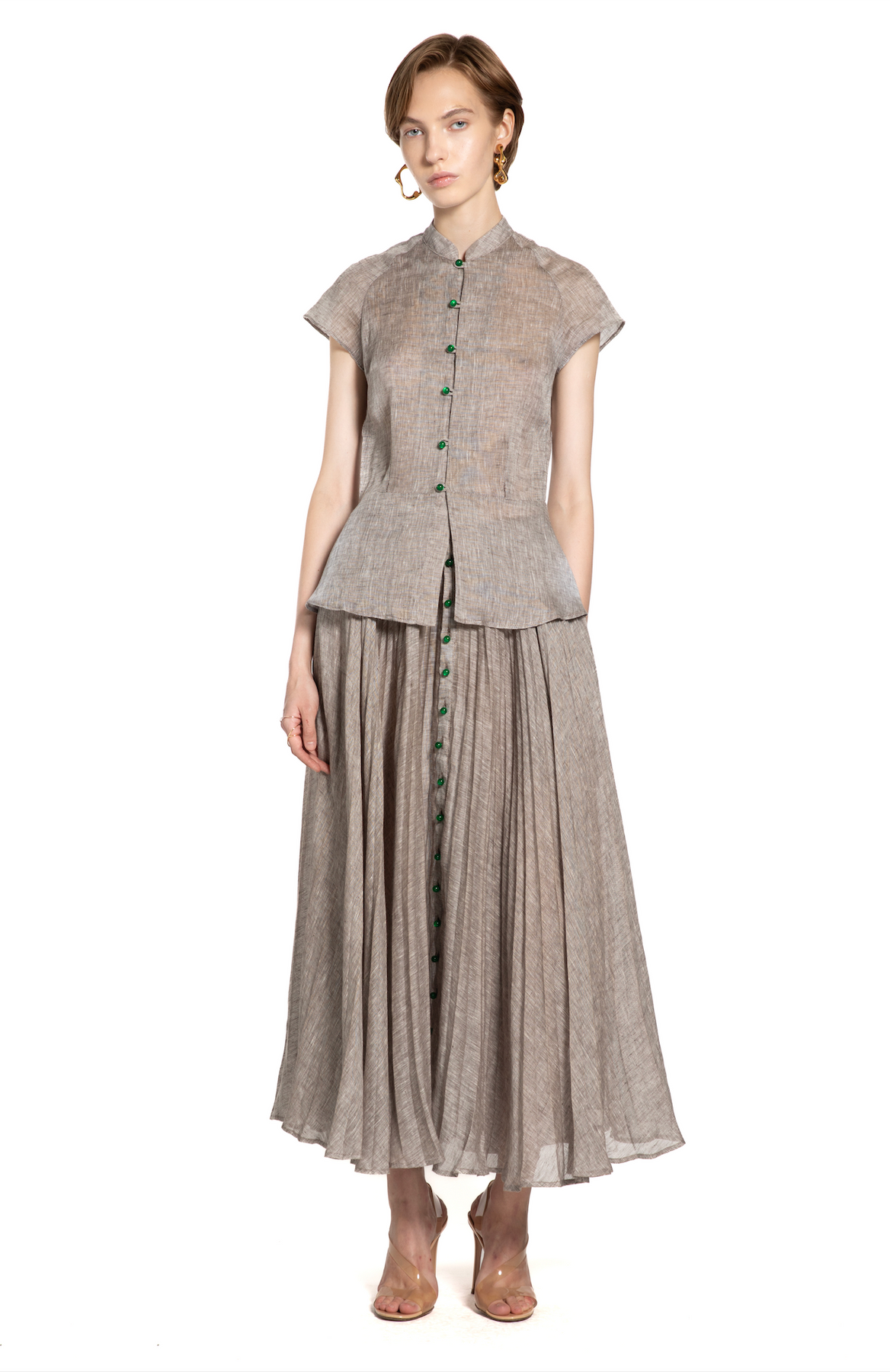 A flowing maxi skirt crafted from Jim Thompson linen, designed with fine accordion pleats that create gentle movement and timeless femininity. The button-front detailing adds a subtle, vintage-inspired touch, while the breathable, natural fabric drapes effortlessly for a relaxed yet refined silhouette. Perfect for elevated daytime looks or understated evening elegance, this skirt pairs beautifully with structured or minimalist tops for a polished, modern finish.