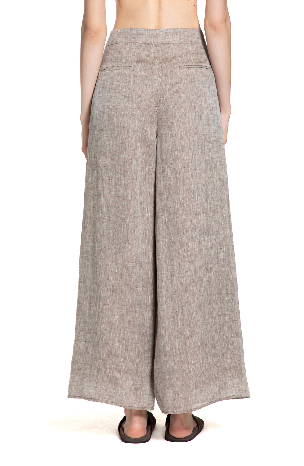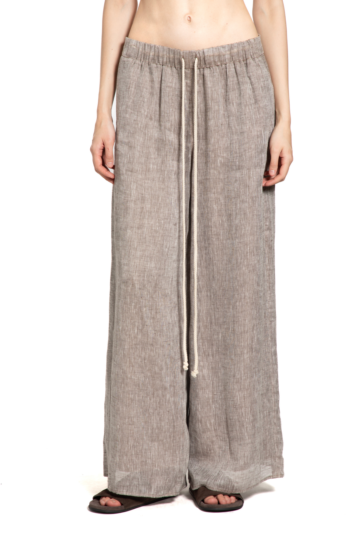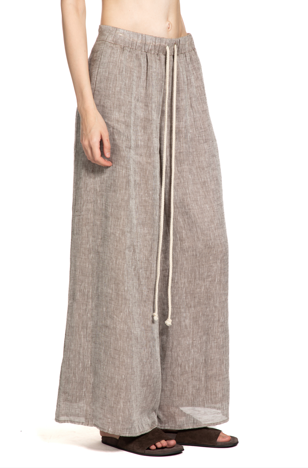 Cut from airy, textured linen, these wide-leg trousers offer a refined take on relaxed tailoring. The elasticated waistband ensures all-day comfort, while the long, minimalist drawstring introduces a contemporary, elongated detail. With a fluid silhouette, the trousers pair seamlessly with the matching asymmetric top—delivering elevated ease for everyday dressing, travel, and resort moments.