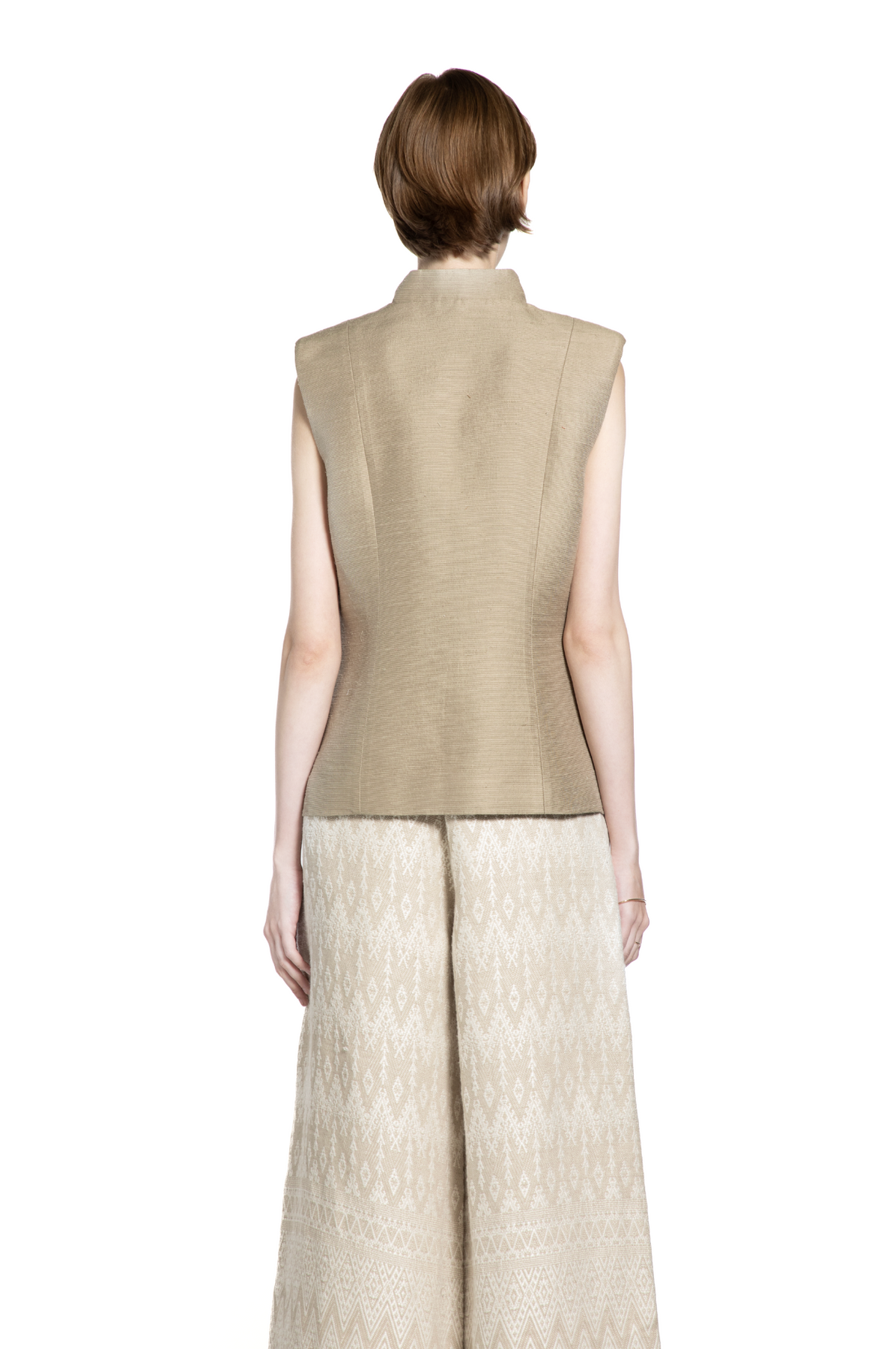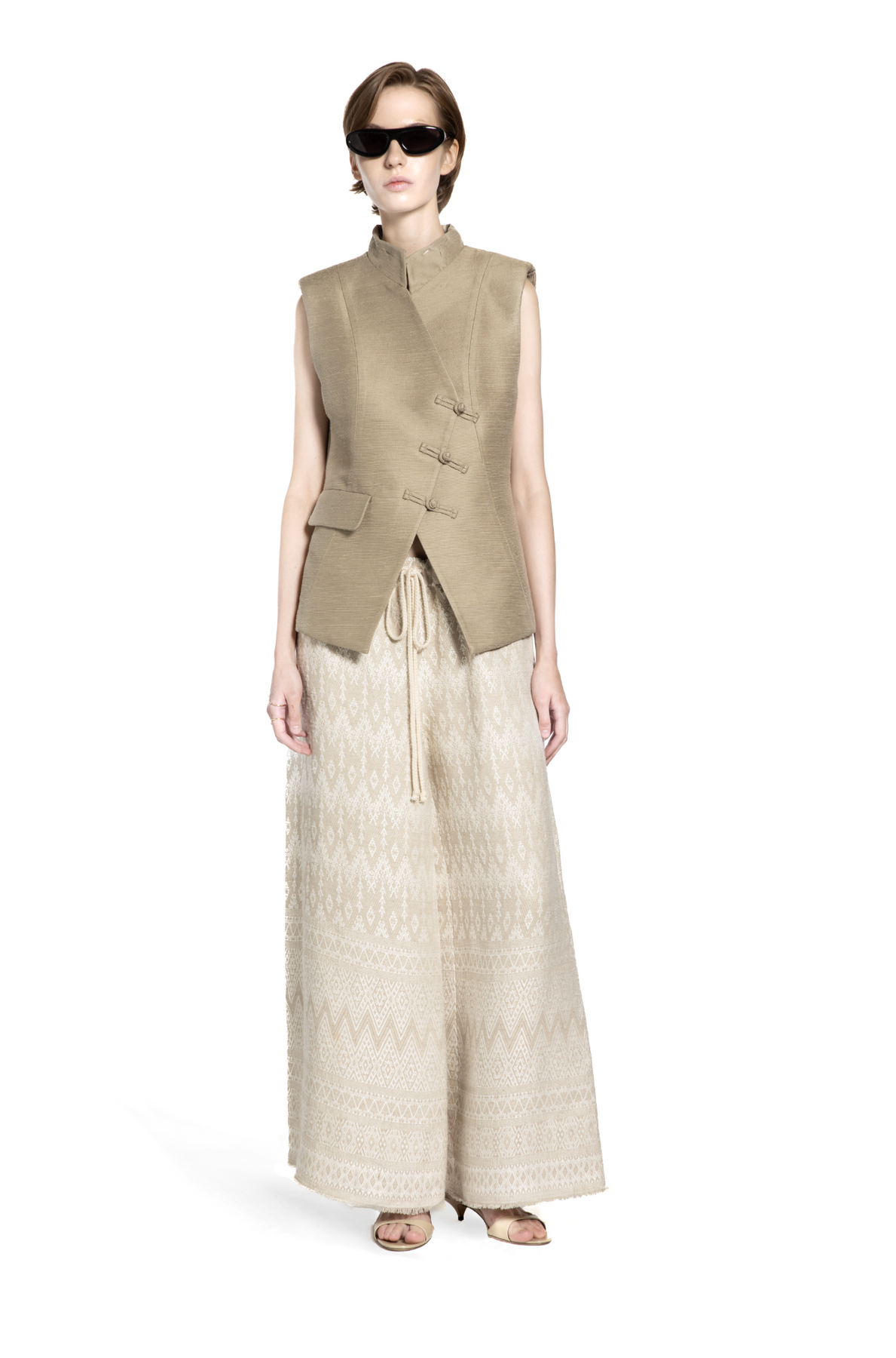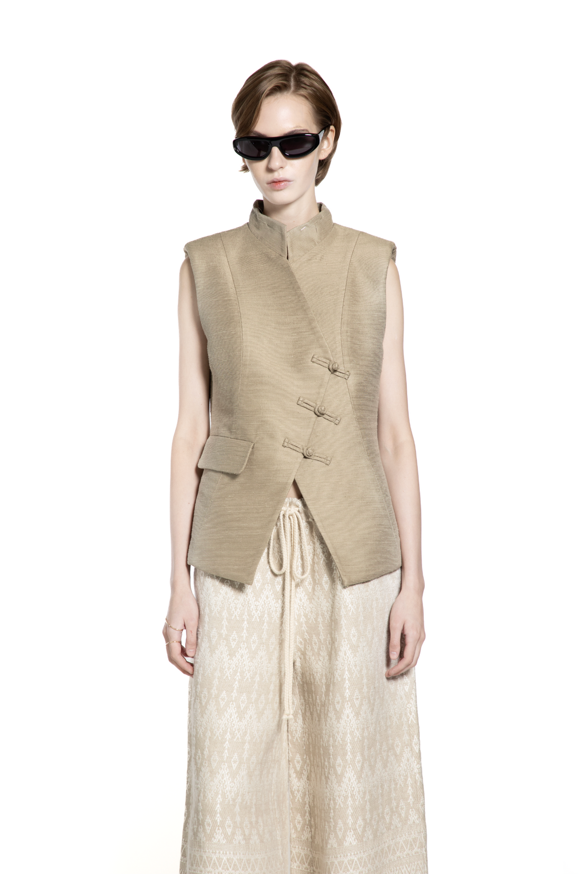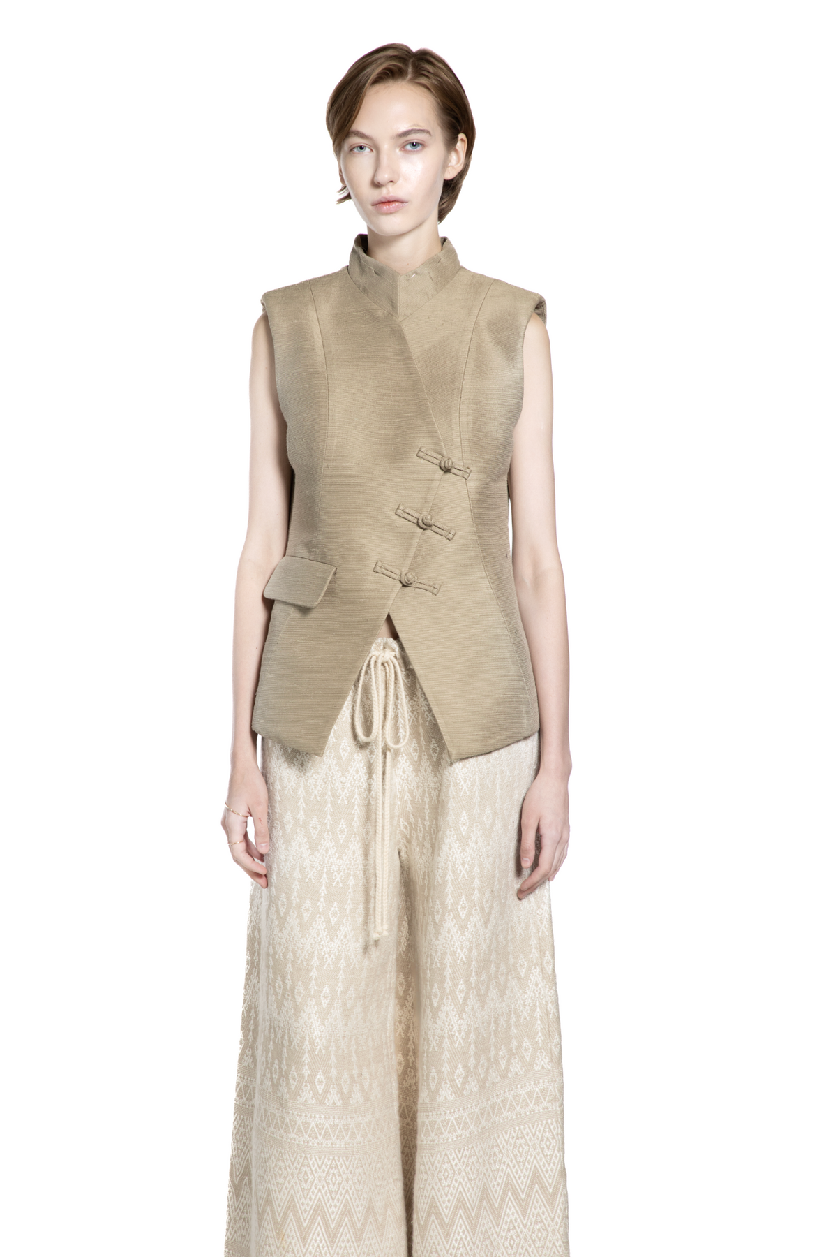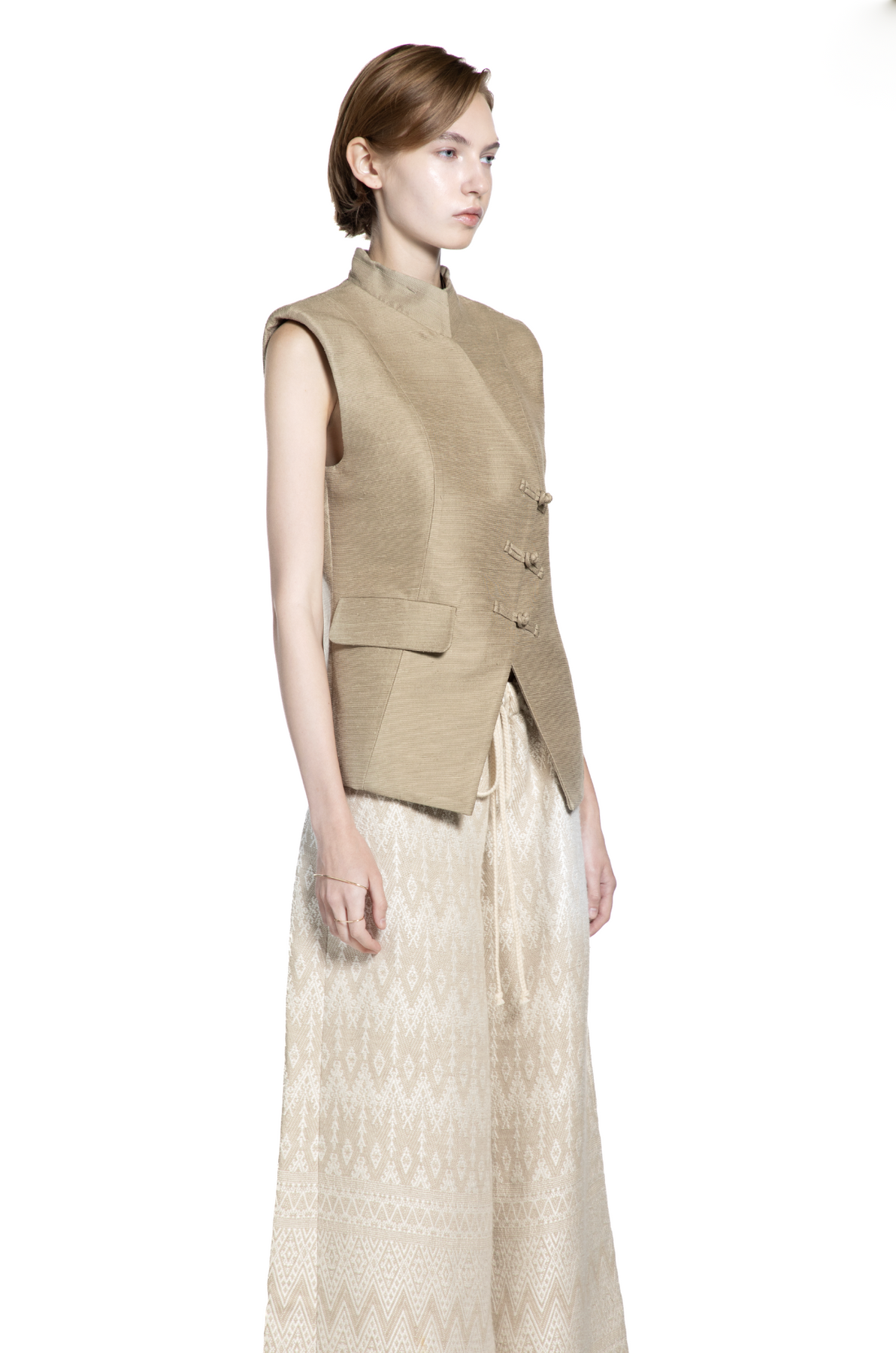 This refined 100% Jim Thompson silk vest blends architectural tailoring with timeless Eastern-inspired detailing. Crafted from a textured, natural-toned silk, it features a sculpted silhouette with clean, padded shoulders and an elegant mandarin collar. The asymmetric front closure is accented with traditional knot-style buttons, offering a unique artisanal touch. A single side flap pocket adds subtle dimension, while the angled hem creates a modern, elongated line. Luxurious yet minimal, this vest is perfect for elevating both casual and sophisticated looks, adding a polished statement to any wardrobe.