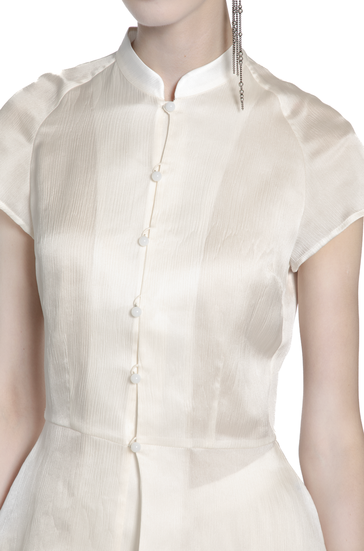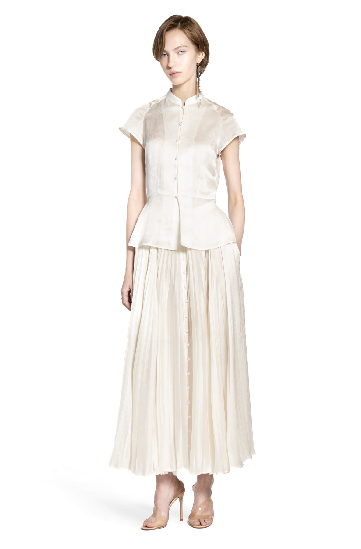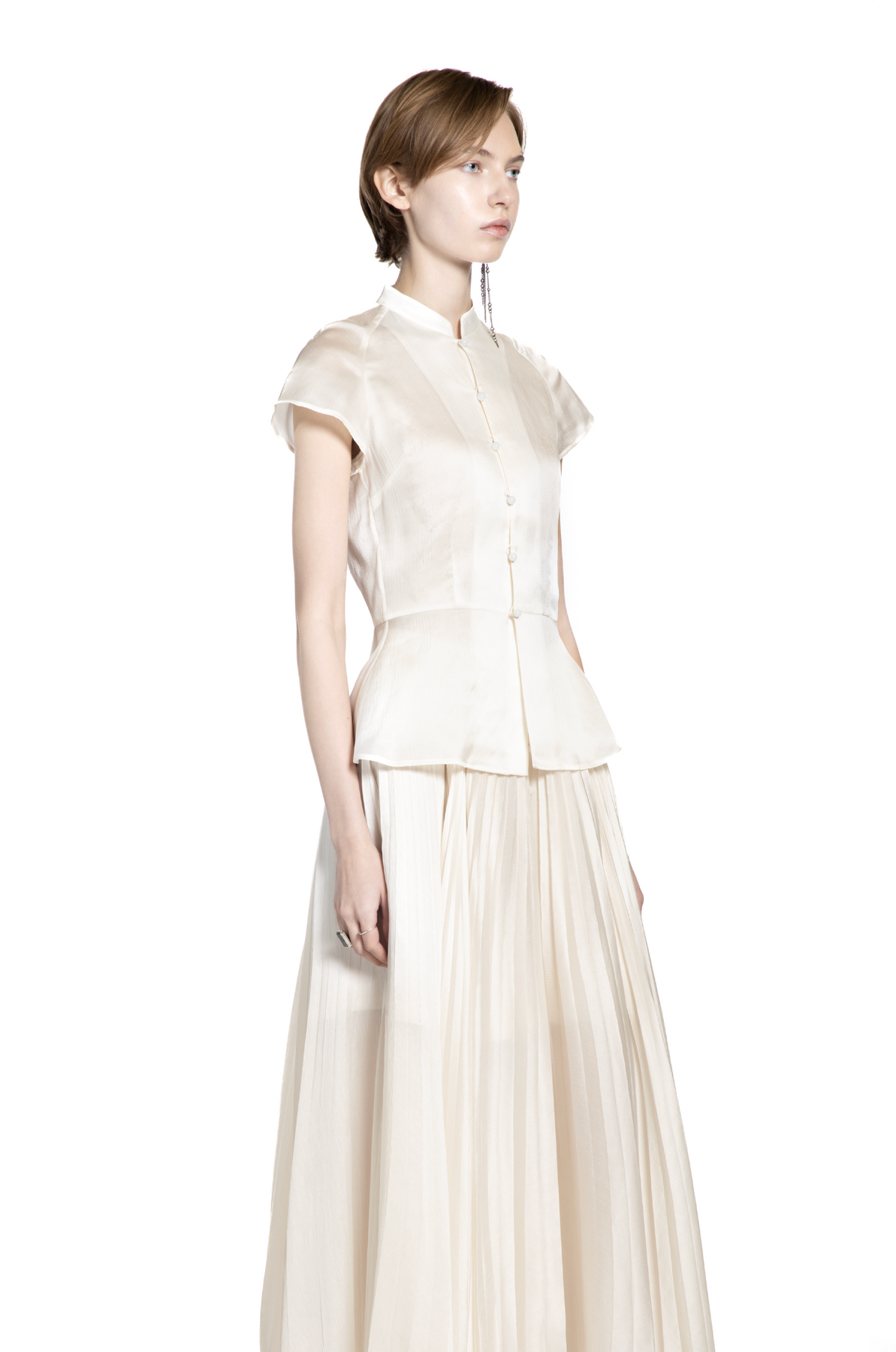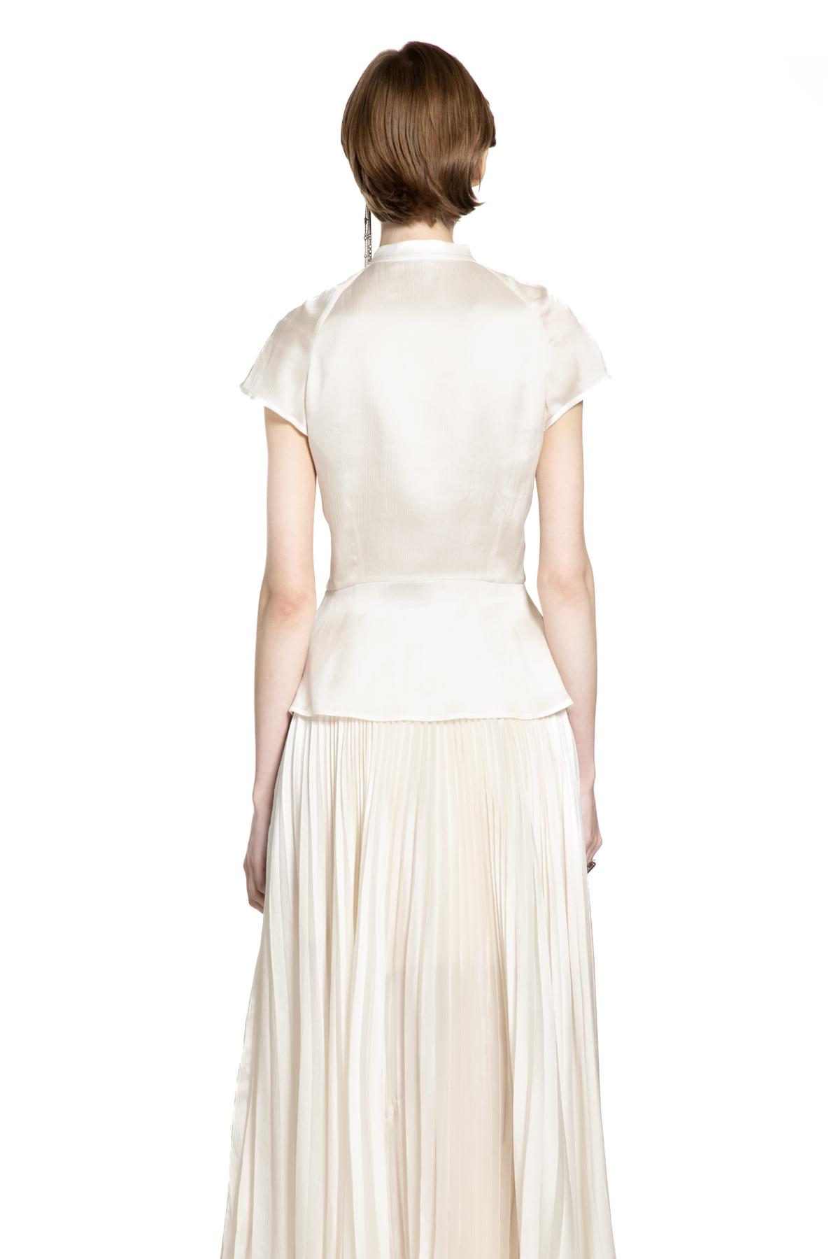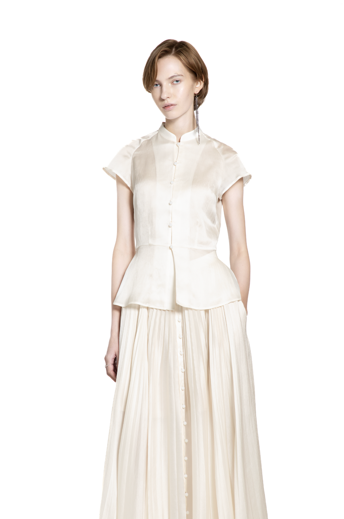 This refined Jim Thompson silk blouse features a softly structured mandarin collar and a row of delicate front buttons for a clean, elegant silhouette. Short cap sleeves and a subtle peplum hem create a flattering shape that highlights the waist while maintaining an effortlessly graceful look. Crafted from a lightweight, lustrous fabric, it brings understated sophistication to both formal and contemporary ensembles.