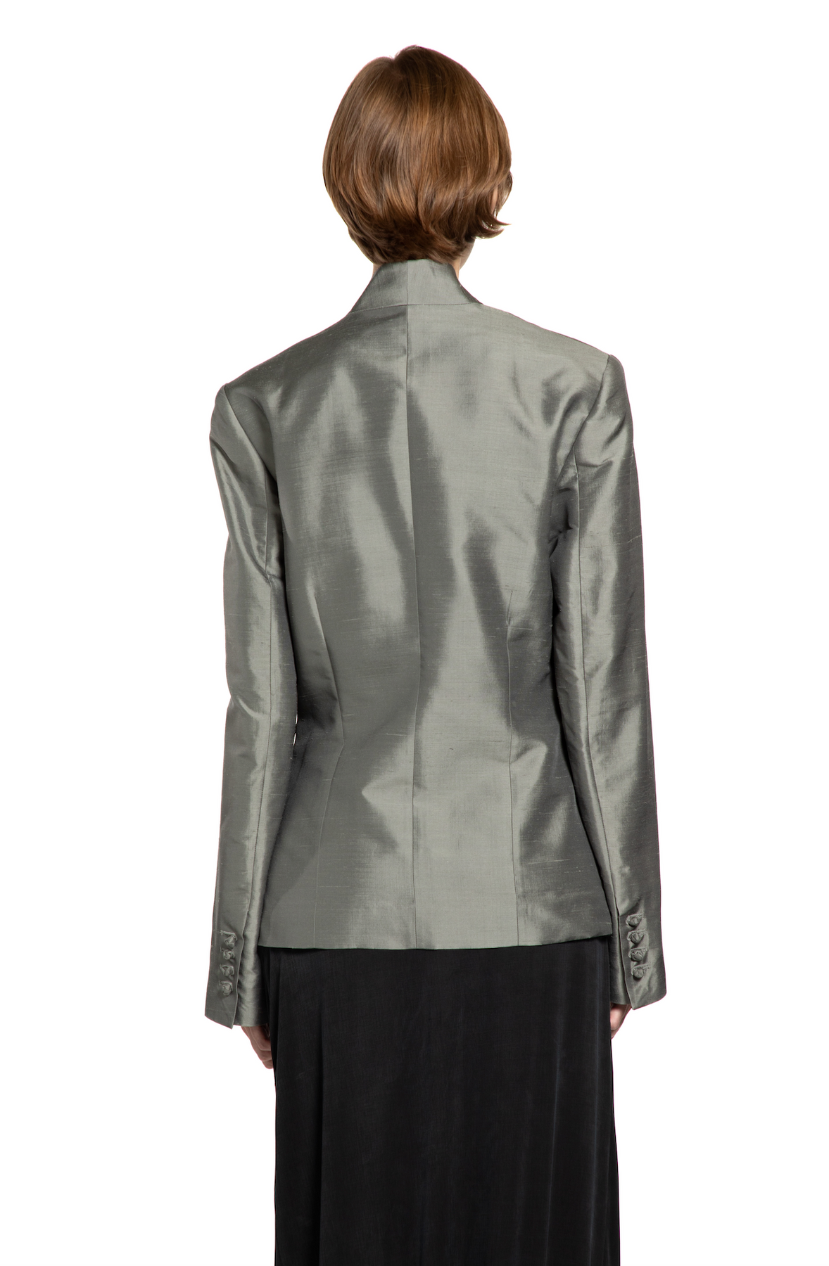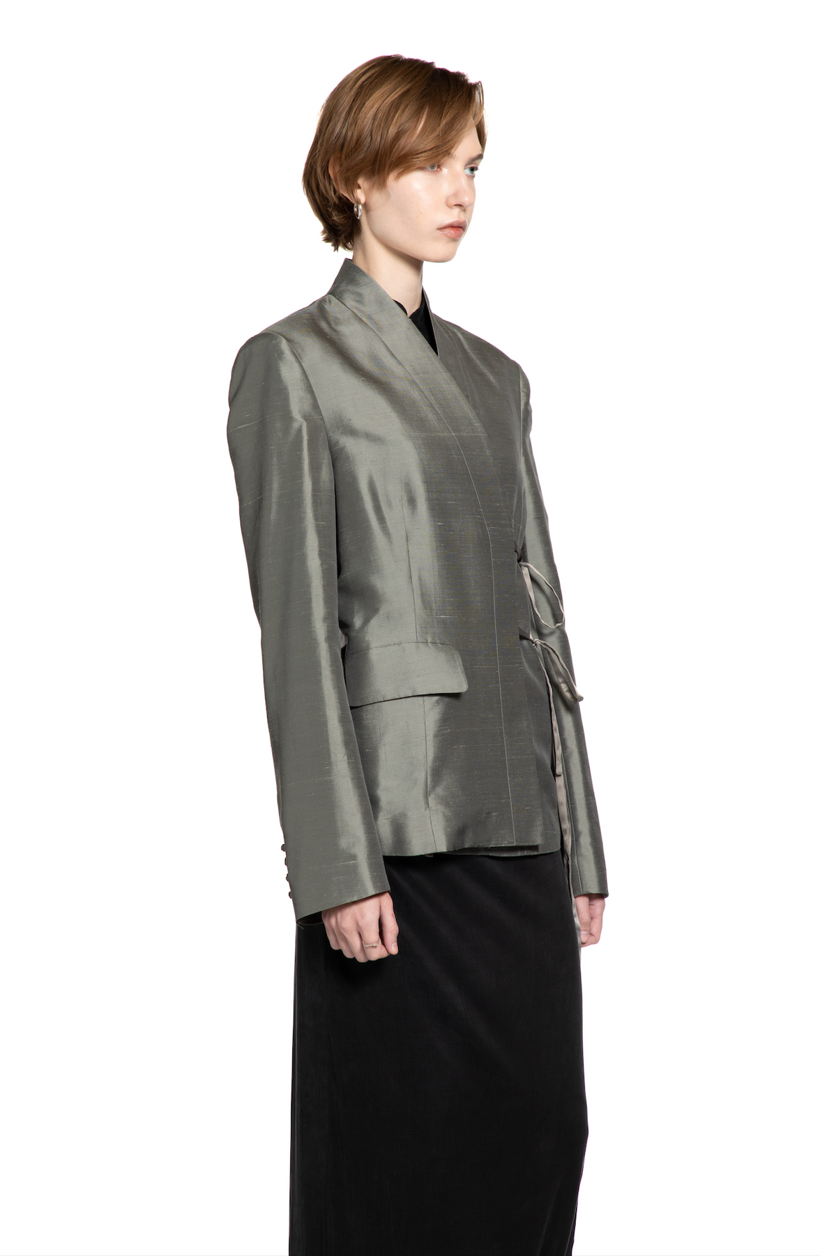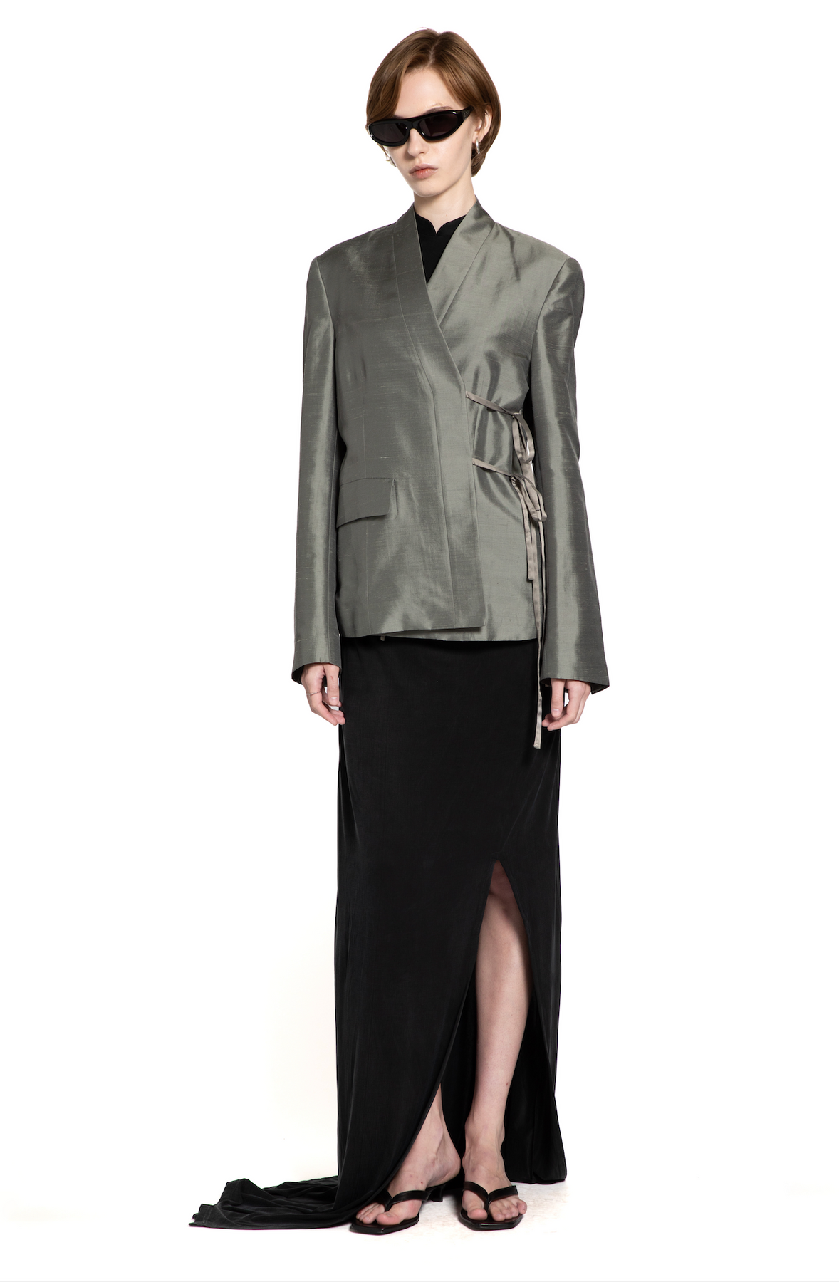 This slate grey silk wrap jacket is crafted from a thin, fluid silk that drapes effortlessly and catches the light with a subtle, refined sheen. Designed with clean, structured tailoring, it wraps across the front and secures with delicate side ties for an adjustable, elegant fit. Long sleeves and discreet flap pockets add functional sophistication, blending modern minimalism with timeless craftsmanship—ideal for elevated daywear or polished evening styling.