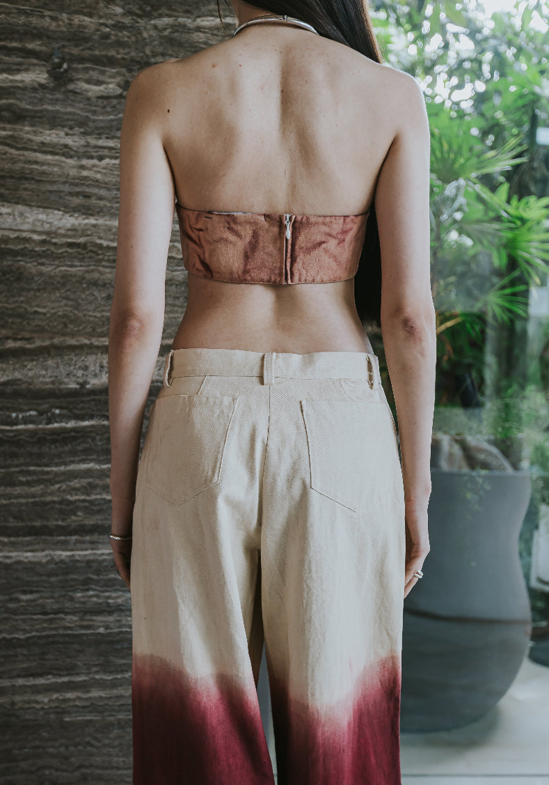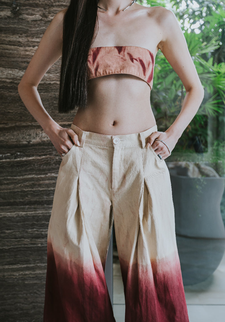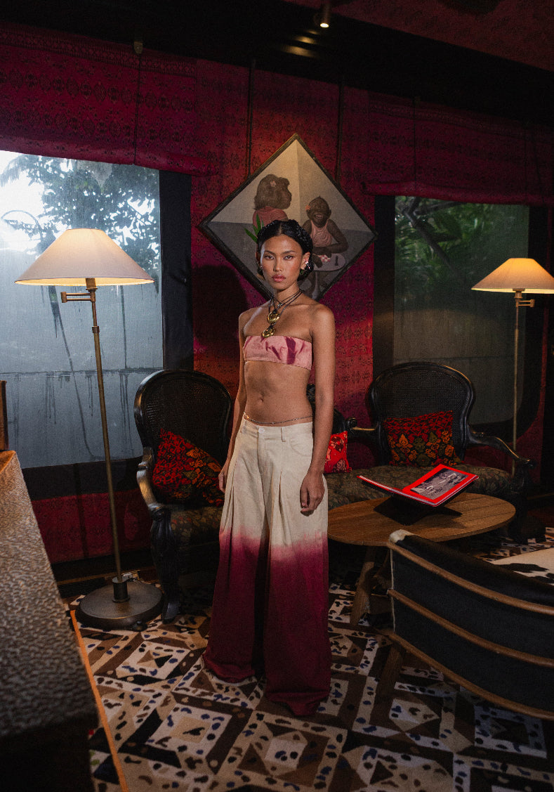 Meticulously crafted to order, this style is made from fabric naturally hand dyed in Bali, reflecting an artisanal process that takes approximately four weeks from creation to delivery.
