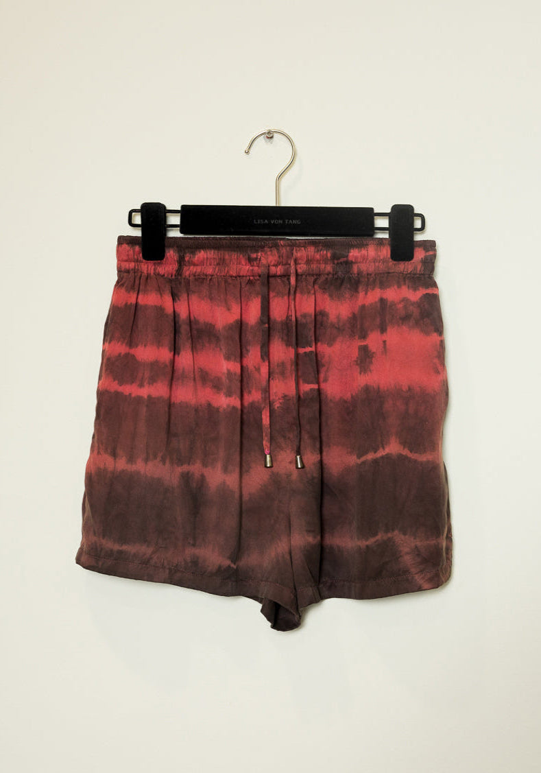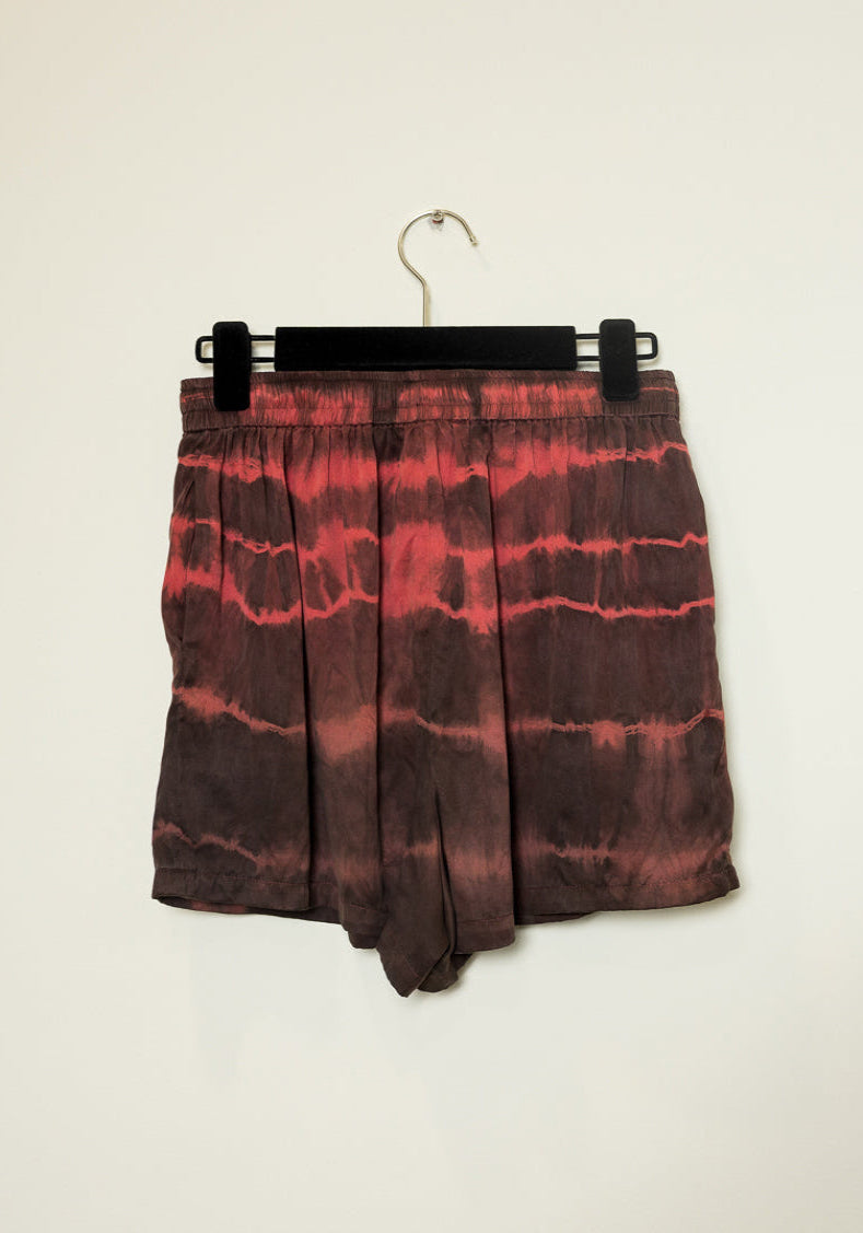 Crafted from 100% silk and hand-dyed in a vibrant Ruby Ripple pattern, these drawstring shorts offer a relaxed, effortlessly chic silhouette. Designed with a comfortable elastic waistband and soft, flowing fabric, they drape beautifully for an easy, elevated feel. Each piece is naturally dyed and entirely unique, celebrating artisanal craftsmanship with a playful, energetic twist.