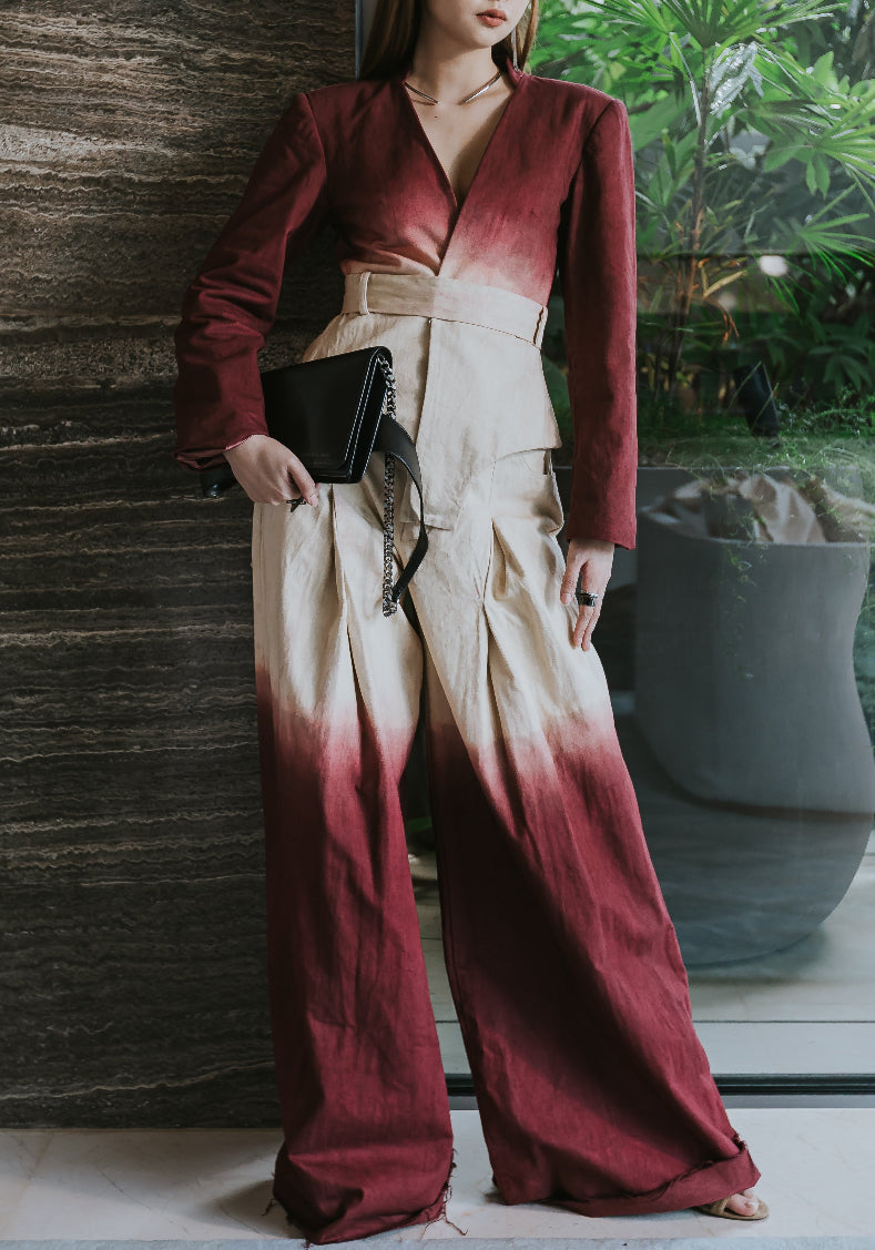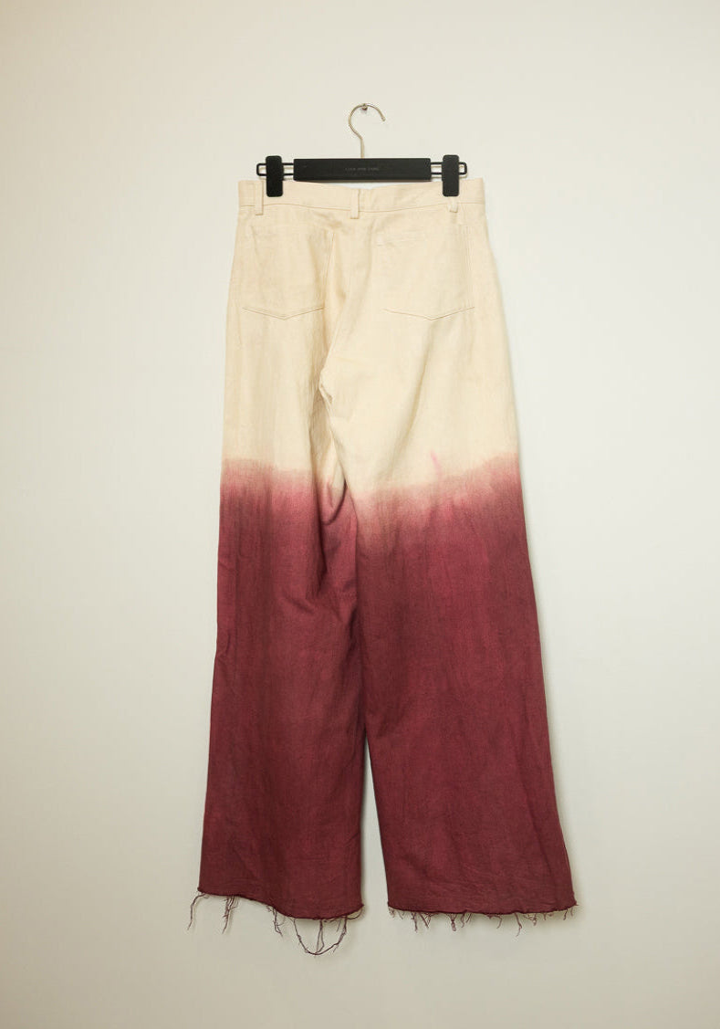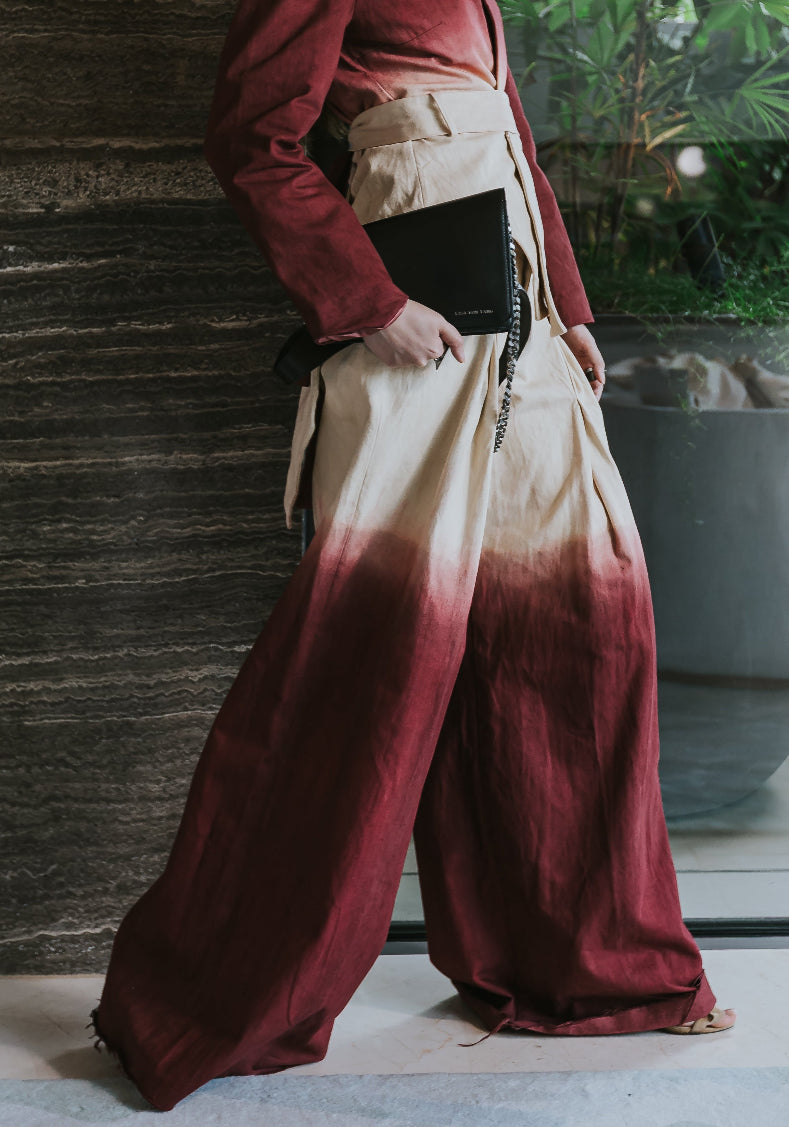 Reimagined in richly dyed cotton that transitions from soft cream to deep sangria, these pants balance structured tailoring with effortless ease. Wide pleats at the front add volume and fluid movement, creating a flattering, modern silhouette. Pair with the matching blazer for a cohesive, polished ensemble that exudes refined sophistication.