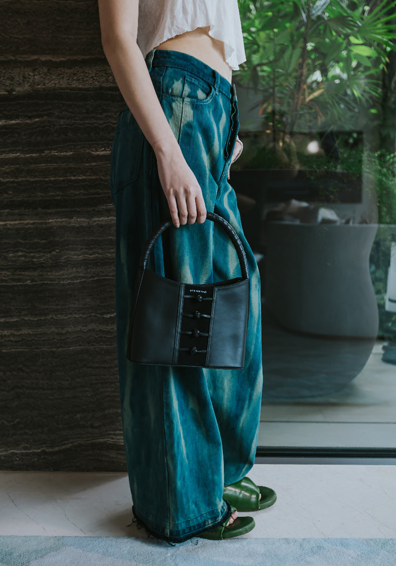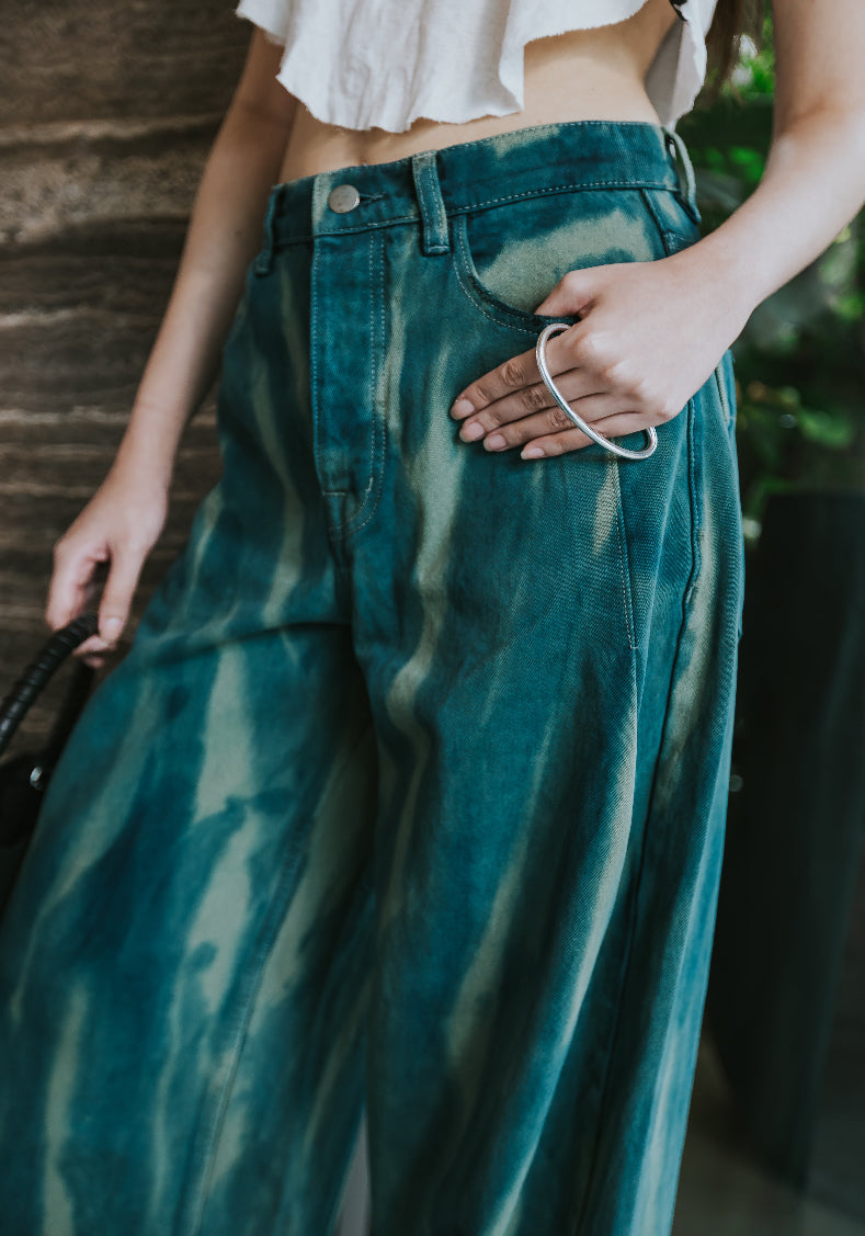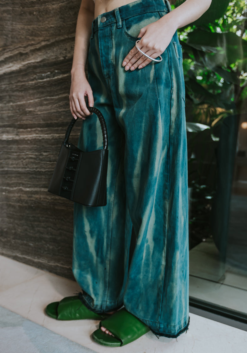 This effortlessly chic piece can be styled oversized, draping gracefully below the midriff, or cinched at the waist for a flattering, tailored look. Crafted from luxurious 100% Japanese cotton denim, the fabric is elevated through an artisanal natural dye process that creates organic, wave-like variations in rich verdant and teal tones—ensuring each pair is uniquely expressive.