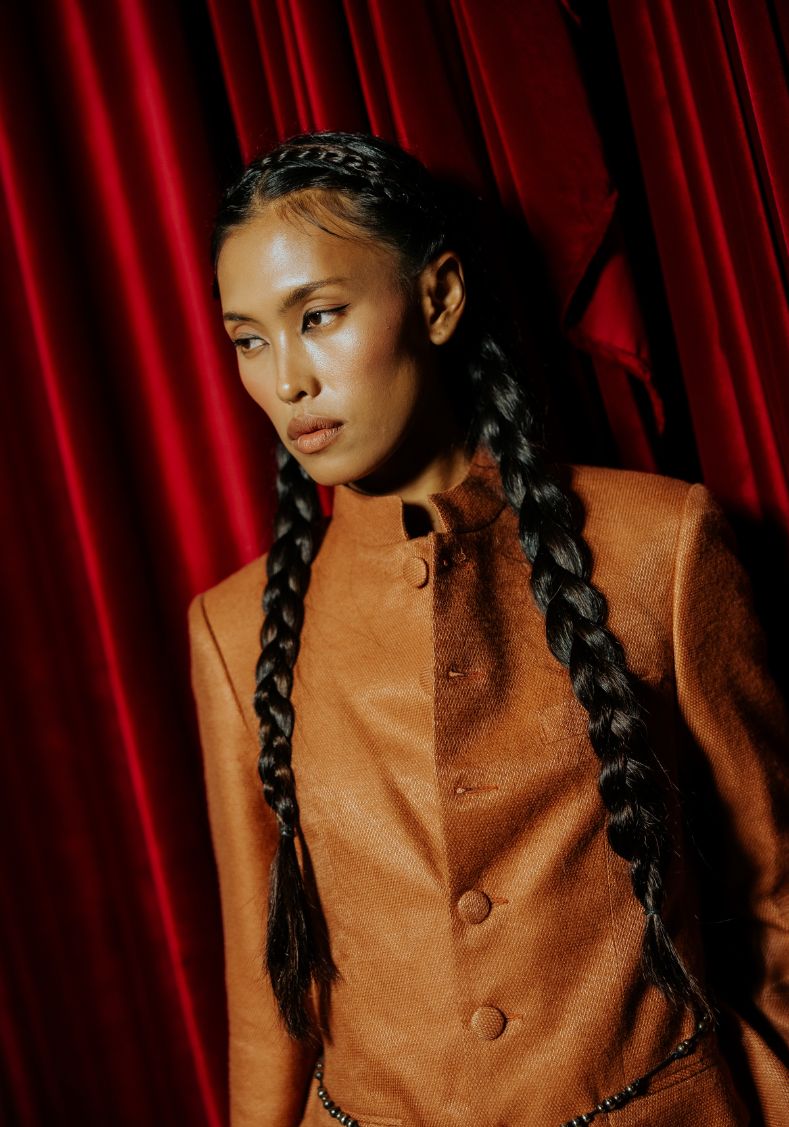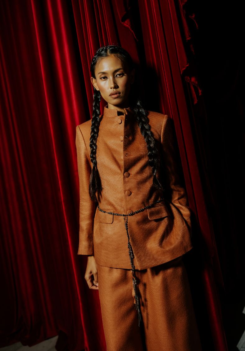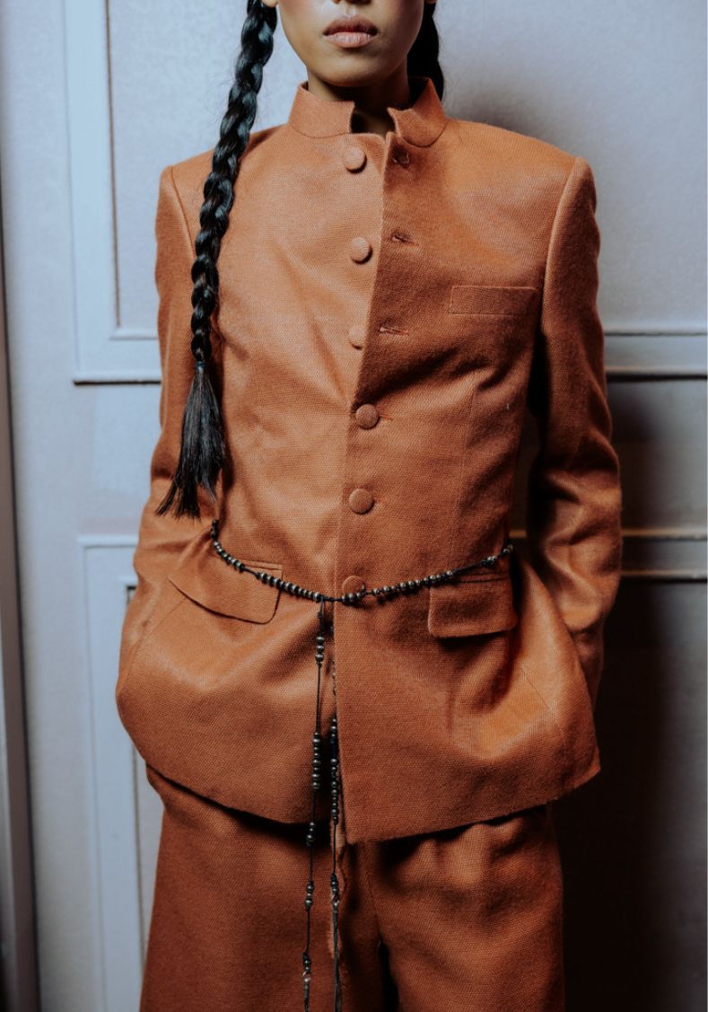 Crafted from 100% wool, the Imperial Sienna Wool Jacket combines structured tailoring with a refined silhouette. The rich sienna tone highlights the jacket’s clean lines, while the mandarin-style collar adds a distinctive, elevated character inspired by classic imperial tailoring.
