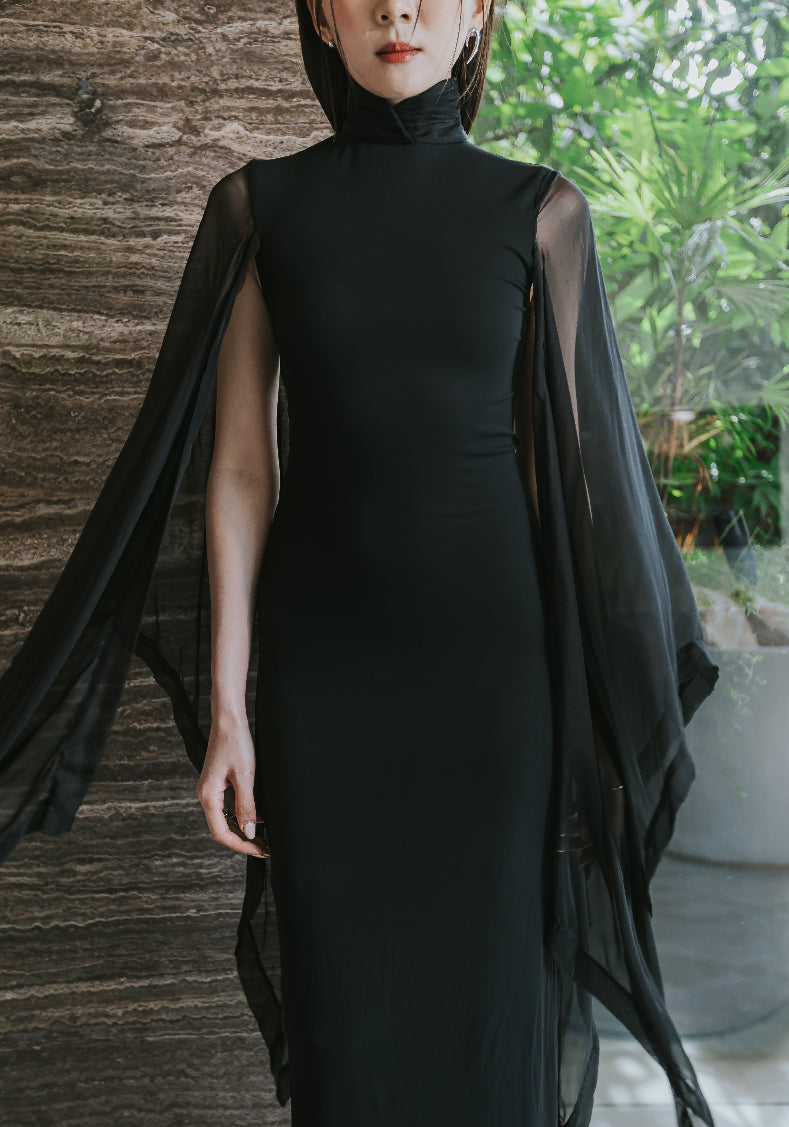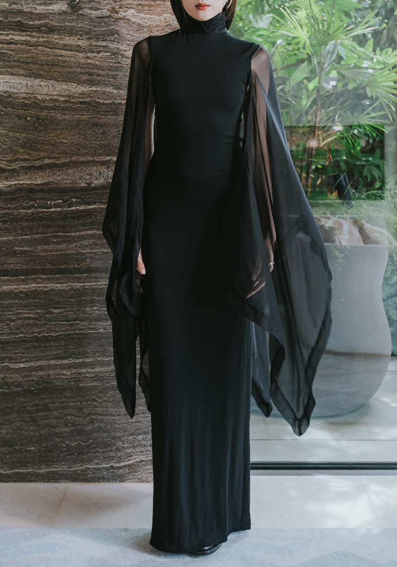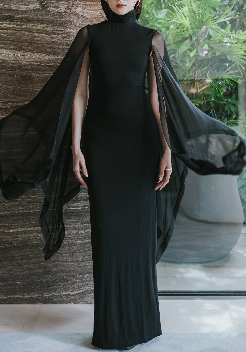 Featuring a sophisticated high collar, the ethereal fabric cascades beautifully to the floor, while the flowy sleeves add an element of grace and movement. Perfect for evening events or special occasions, this dress combines sophistication with a hint of drama, ensuring you captivate every room you enter.
