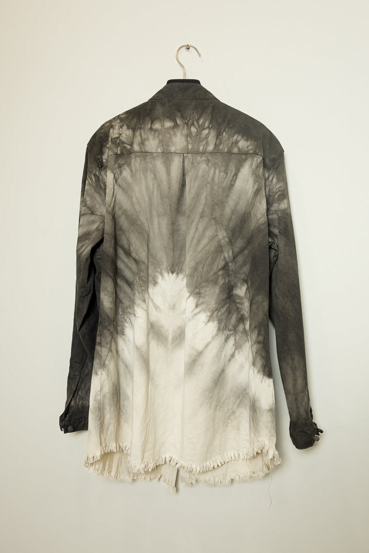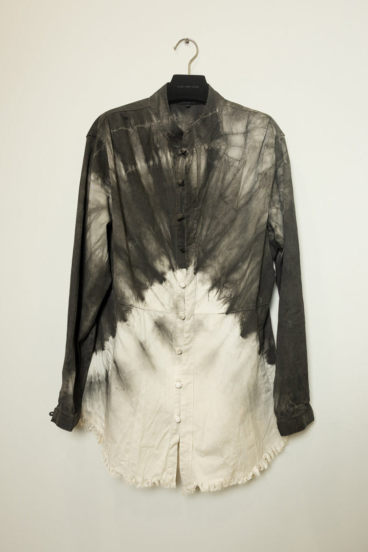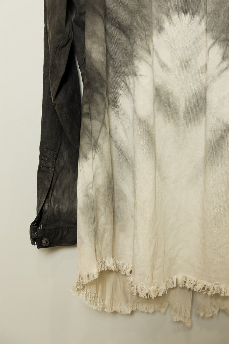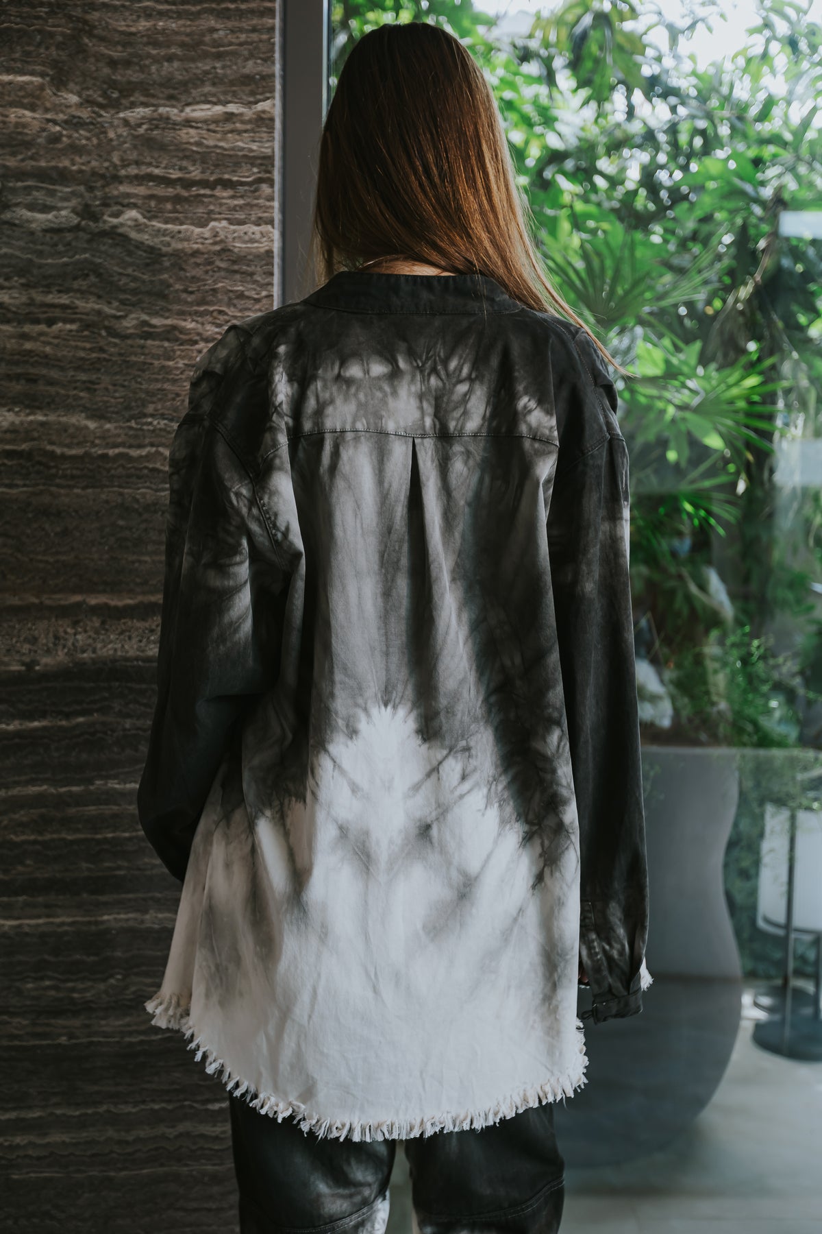 An exploration of shadow and texture, this piece embodies understated luxury with an artisanal edge. Crafted from premium cotton, the fabric is hand-treated to create a striking ink-wash gradient that moves from deep charcoal to soft ivory, making each piece uniquely expressive.