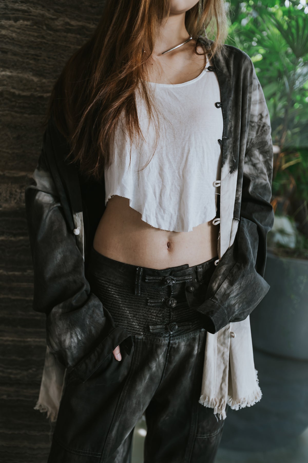 Designed with an elongated silhouette, this versatile style can be worn buttoned as a statement shirt or layered as a refined overshirt over a T-shirt or fine knit. Two discreet front pockets enhance its functionality, while traditional Chinese knot buttons lend a subtle heritage detail and effortless closure. The hem is intentionally frayed for a deconstructed finish, adding movement and modernity to the clean, tailored lines.