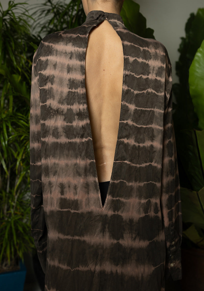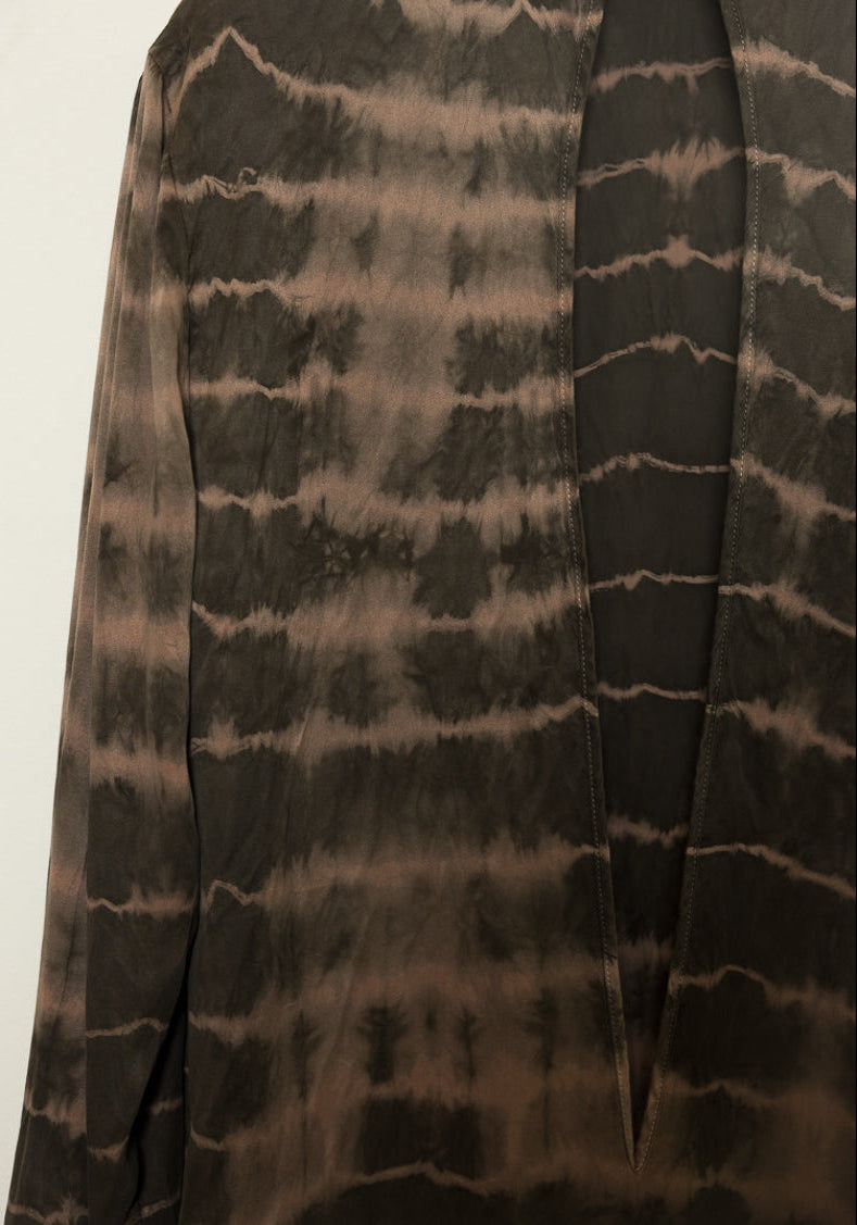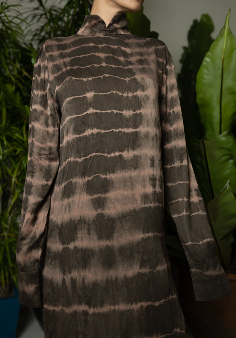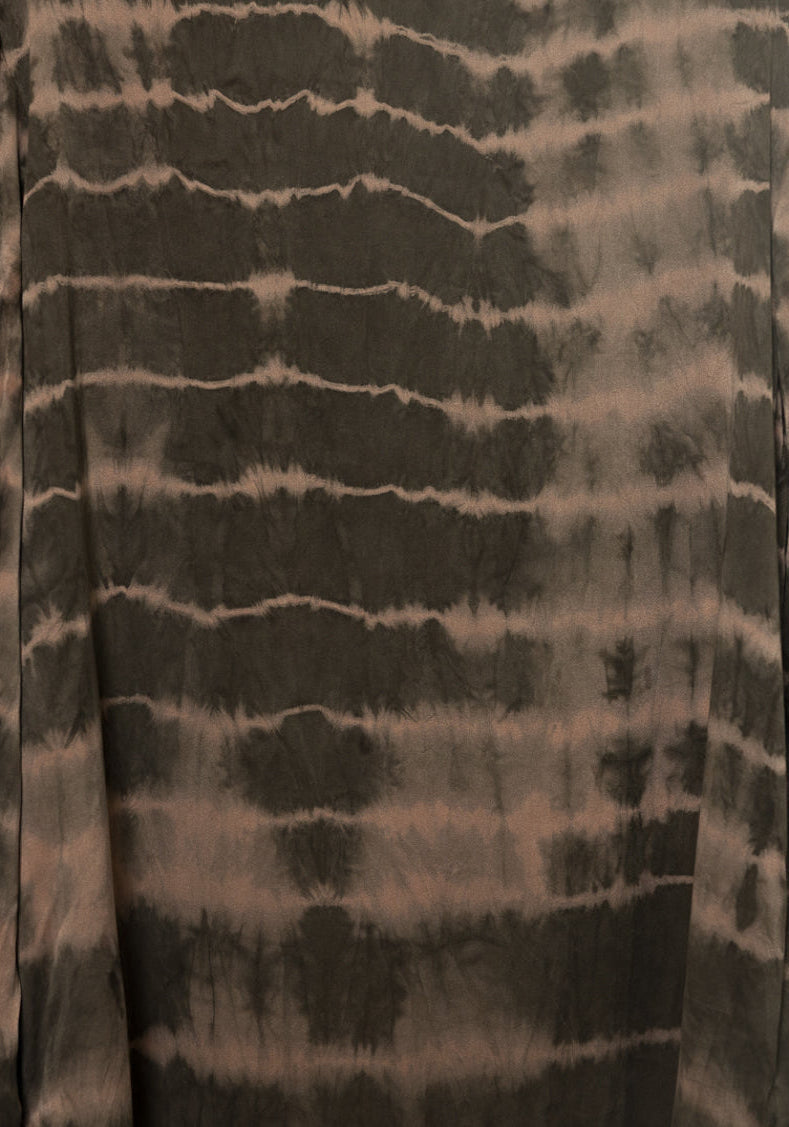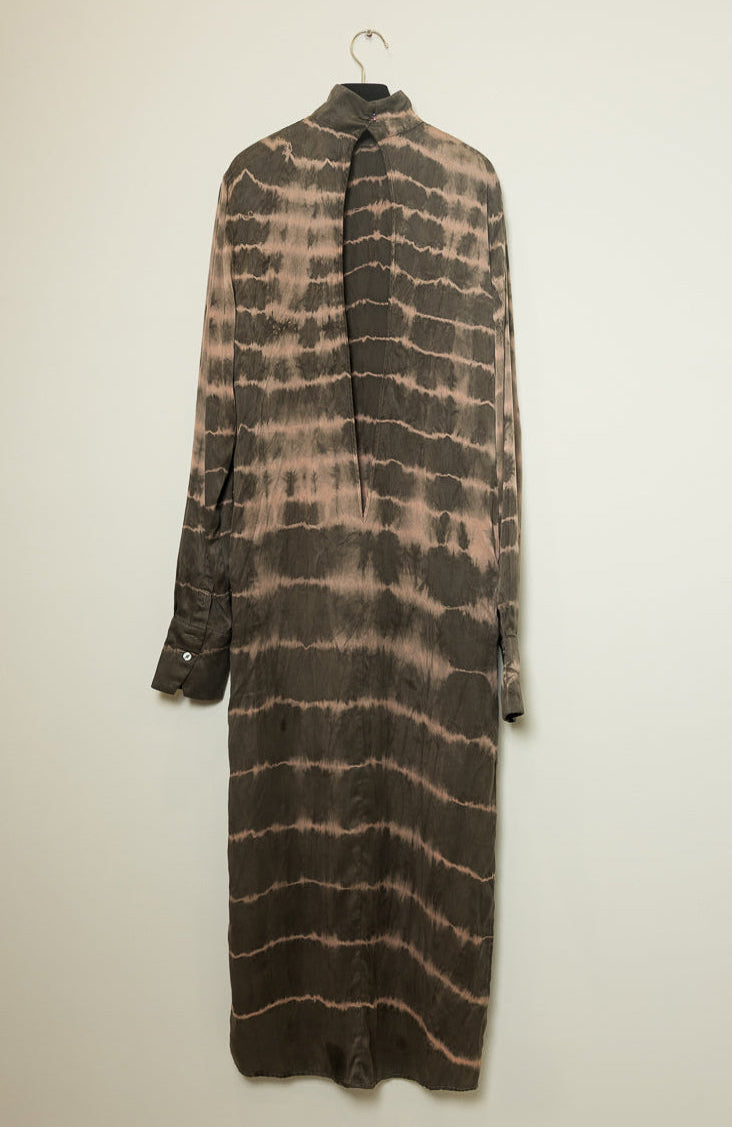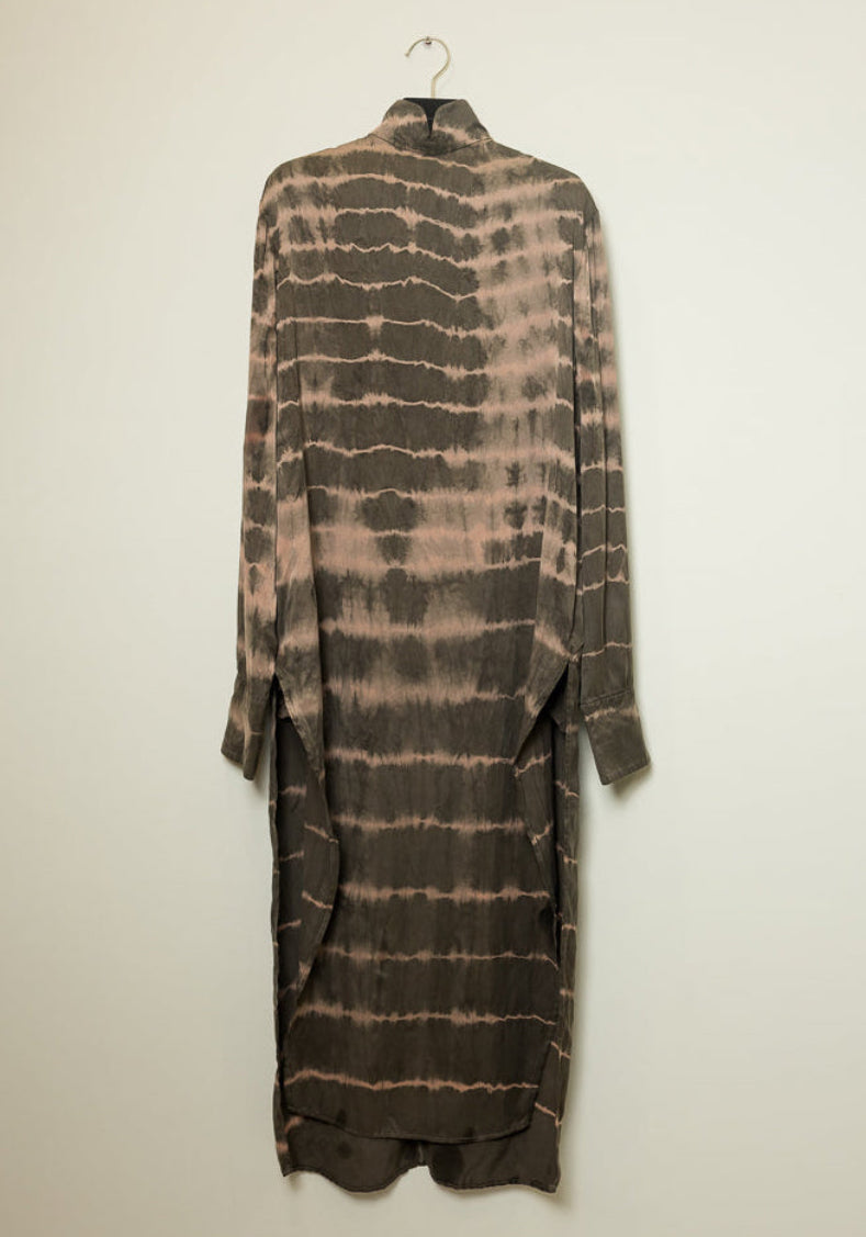 Designed with long, loose sleeves, this dress offers a relaxed fit for ultimate comfort while adding a contemporary twist to a classic silhouette. Hand-dyed in a unique ripple pattern, each piece is naturally colored and entirely one-of-a-kind, celebrating artisanal craftsmanship. The side slit enhances its allure, creating an elegant balance between refinement and boldness.
