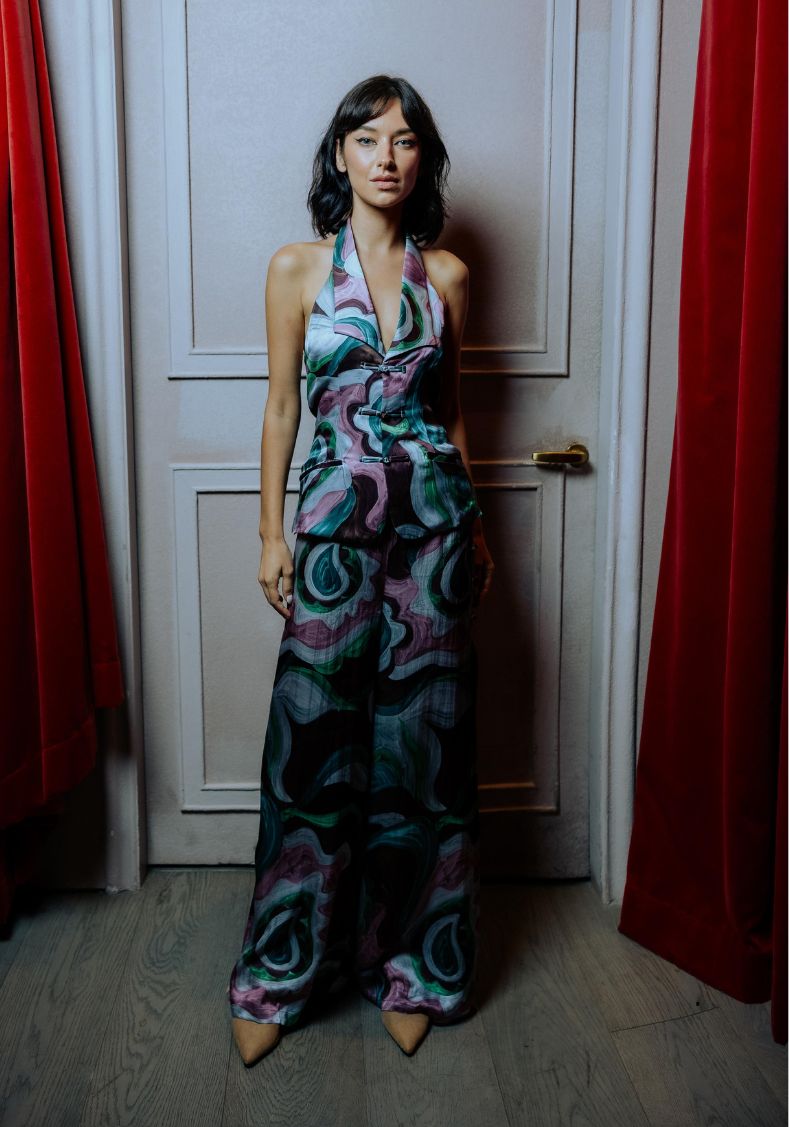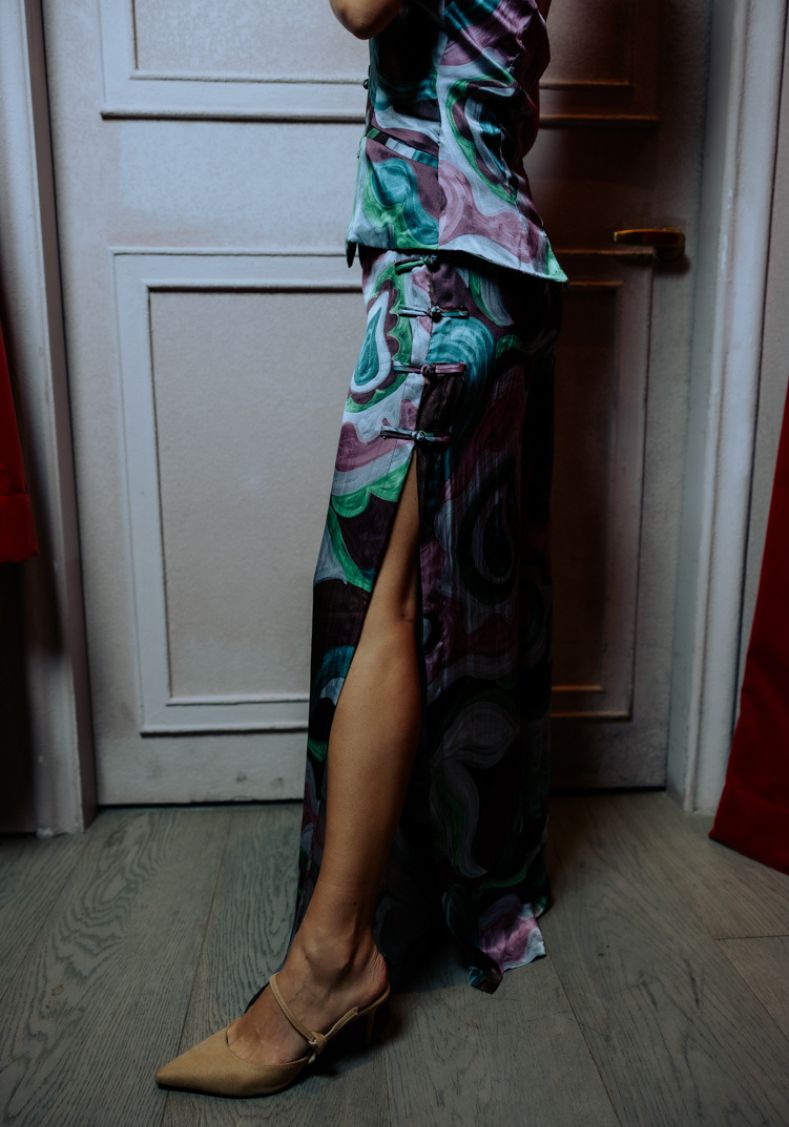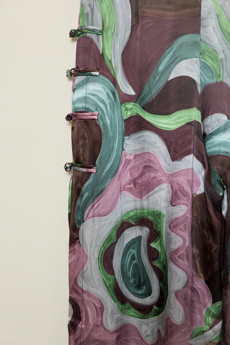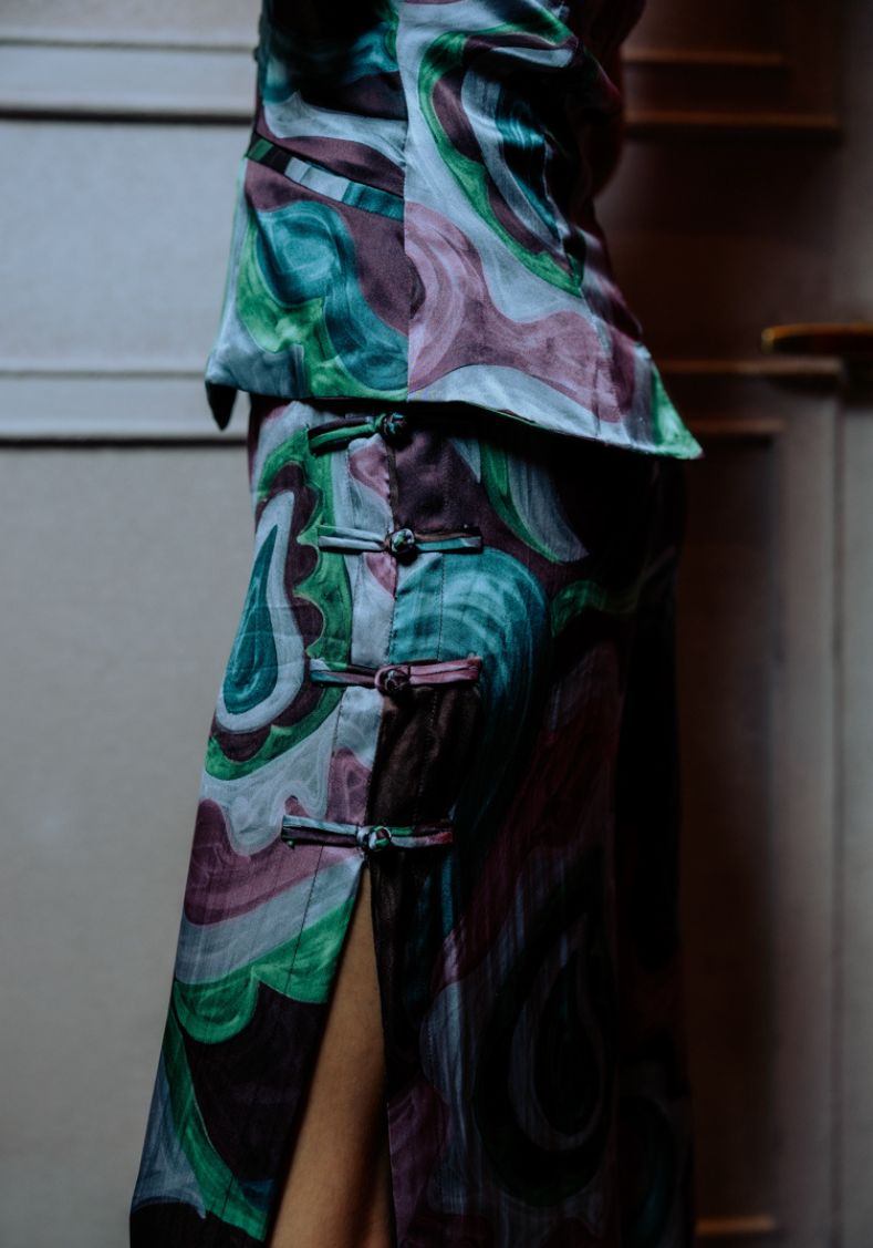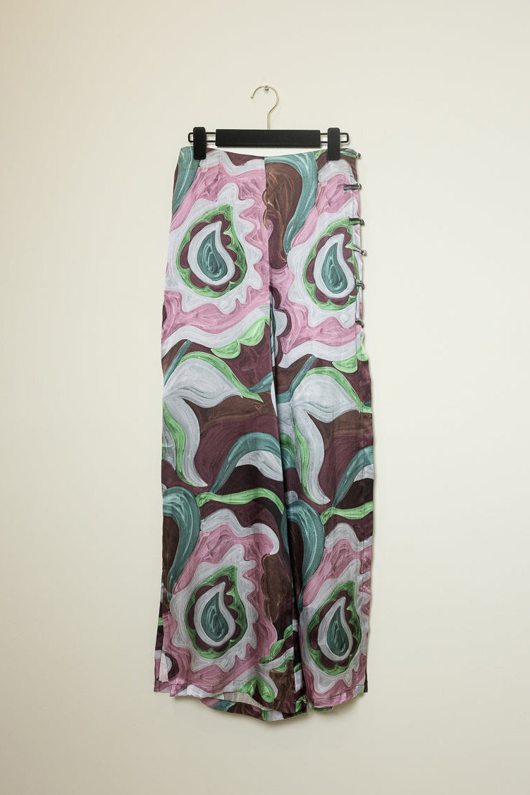 Crafted from 100% Italian silk, the Ciel Straight Printed Trousers feature a captivating abstract painterly print. Made from heavyweight silk, these statement trousers are designed to turn heads. A row of contrasting mandarin buttons at the hip allows for easy dressing, each button meticulously handmade.