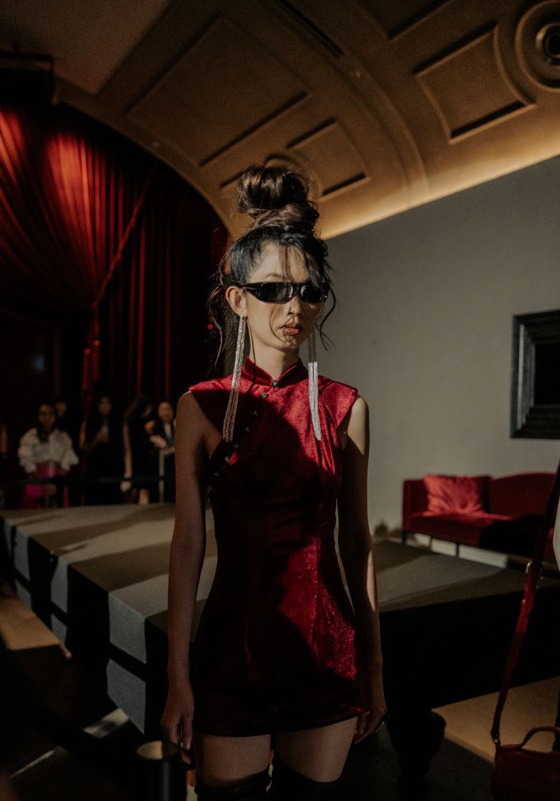 The Imperial Red Dynasty Cheongsam Dress is crafted from sumptuous stretch velvet and reimagined in a modern mini silhouette. Distinctive shoulder panelling introduces architectural structure and a strong, commanding presence beyond the traditional cheongsam form. A sculpted mandarin collar and diagonal jade-button closure pay homage to heritage craftsmanship, while clean lines and contemporary proportions deliver bold, modern elegance. Designed to transition seamlessly from refined day occasions to elevated evening moments, this piece embodies modern dynasty dressing.