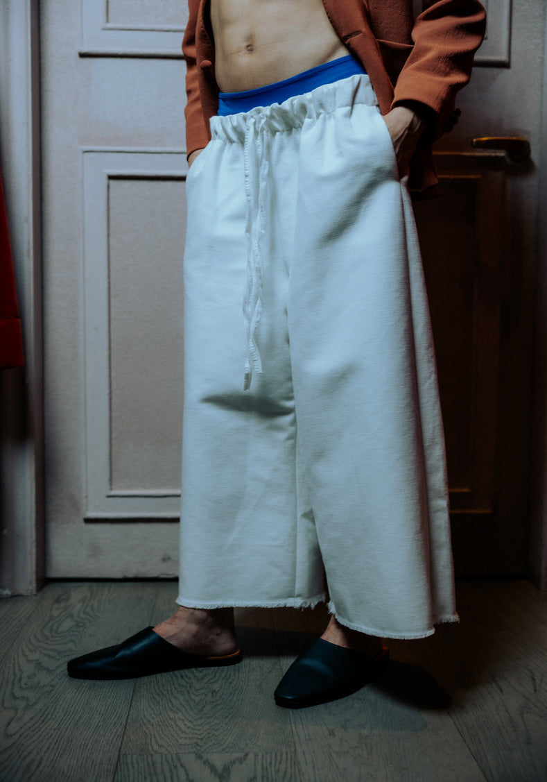 Crafted from 100% Italian cotton twill, these wide-leg trousers combine structure with effortless ease. The elasticated front waistband ensures comfort and a flattering fit, while a long raw string adds a subtle, artisanal detail. Designed for fluid movement and modern versatility, the trousers fall elegantly to the ankles, offering a refined yet relaxed silhouette perfect for both elevated casual looks and polished styling.