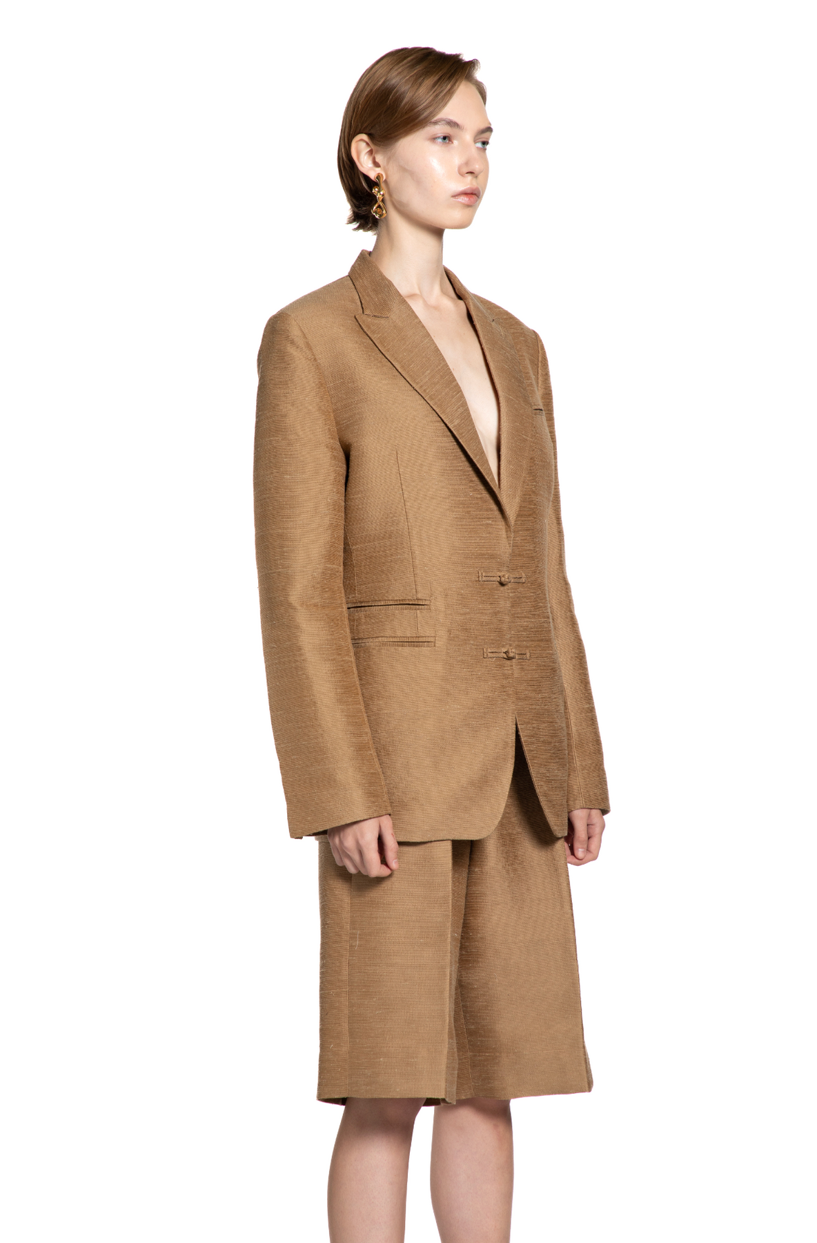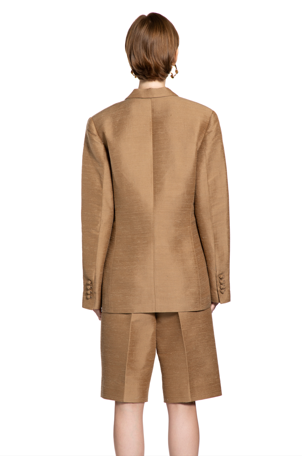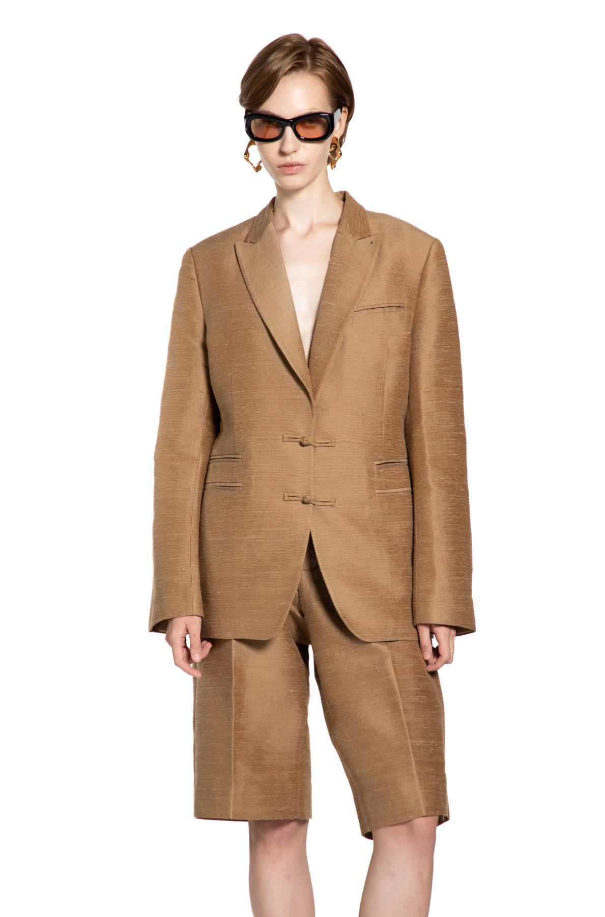 Tailored from luxurious Jim Thompson silk, the Silk Sculpted Blazer offers a contemporary interpretation of power dressing with a polished, high-impact silhouette. The natural sheen and rich texture of the silk elevate its architectural lines, while the structured shoulders and elongated profile deliver a clean, commanding presence. Finished with artisanal knot-style closures that echo Eastern-inspired craftsmanship, this blazer bridges modern tailoring with refined heritage—perfect for boardroom engagements, elevated soirées, or sophisticated day-to-night transitions.
